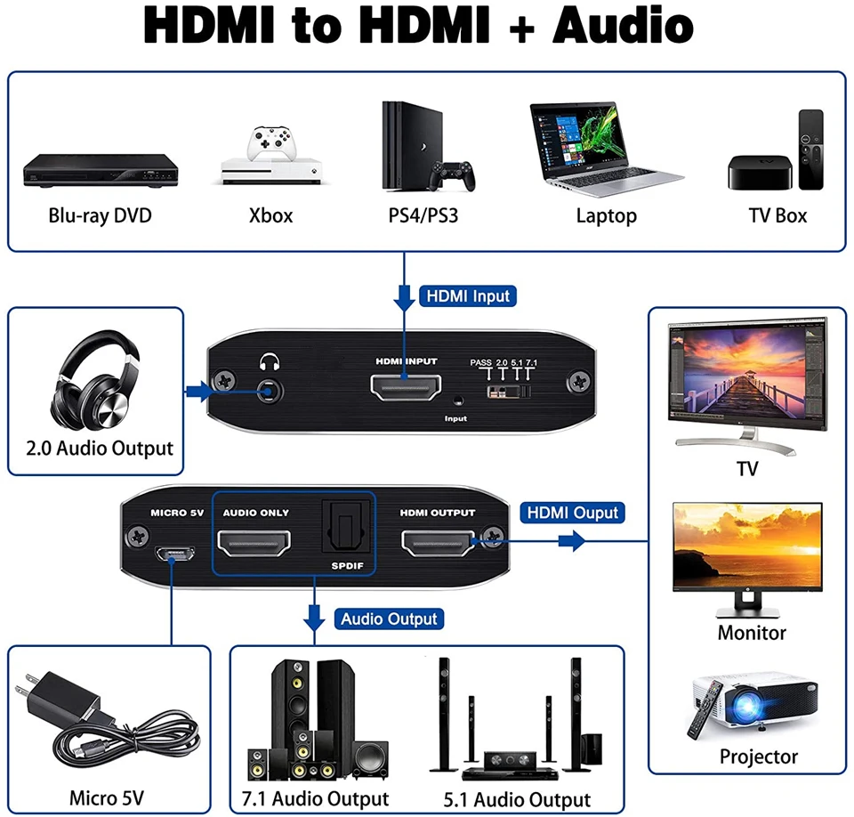 Extractor de audio HDMI: Con TOSLINK SPDIF óptico + 3,5mm + salida de audio HDMI le permite extraer el sonido de la fuente de entrada HDMI (como PS4,Xbox one, etc. ) A su barra de sonido o amplificador, sin necesidad de conectar el televisor o el monitor.