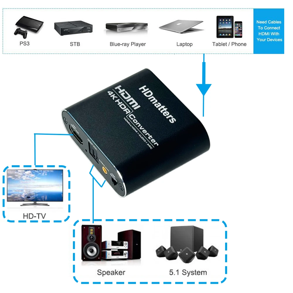 El convertidor de audio HDMI 4K extrae la señal de audio de la fuente de video HDMI. El divisor de audio HDMI 2.0 de HDmatters admite audio estéreo analógico, así como transmisiones de audio multicanal de alta definición a través de la salida de audio óptica coaxial digital.