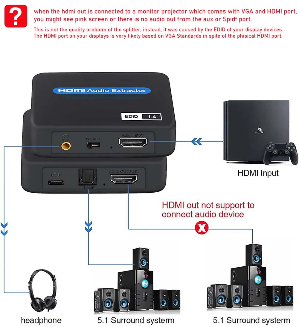 4) El extractor de audio no es compatible con HDMI ARC ni Earc.Y no puedes conectar la salida HDMI al receptor AV para audio HDMI.