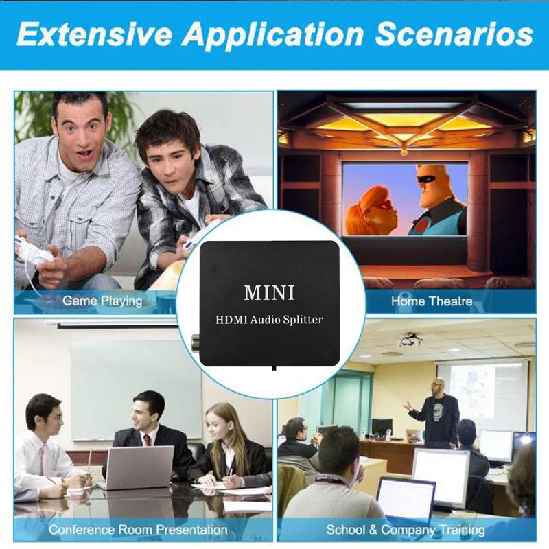 Este divisor de audio HDMI puede extraer la señal de audio incrustada en fuentes HDMI y convertirla en salida de audio analógica de 3,5mm y salida SPDIF al mismo tiempo.