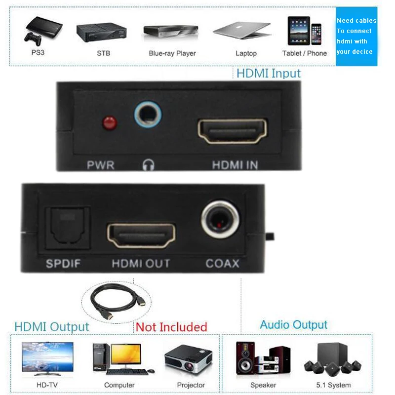 This hdmi audio splitter can extract the audio signal embedded in HDMI sources and convert it to 3.5 mm analog audio output and SPDIF output at the same time.