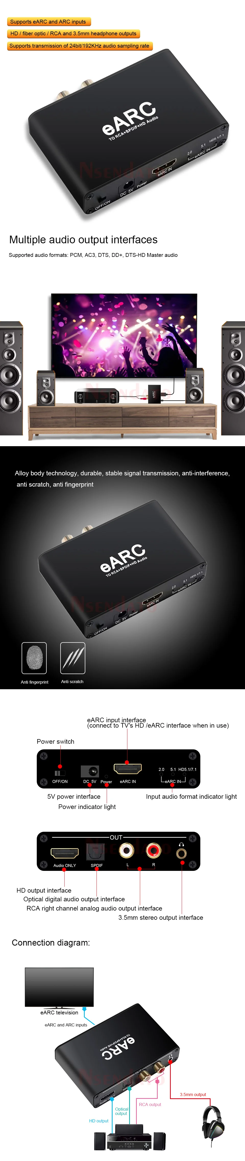 Extractor de audio HDMI eARC ARC a RCA de 192KHz, convertidor eARC HDMI, solo Audio para Dobly DTS AC3 LPCM TV Coaxial óptico