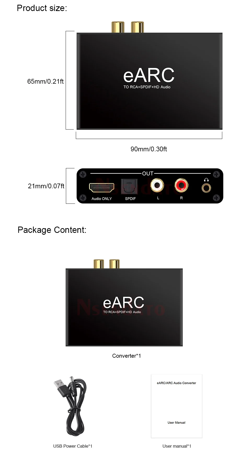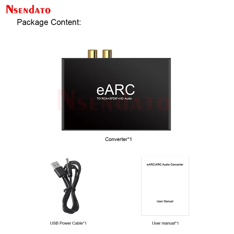Introducción:Este producto está diseñado para Nsendato de amplificadores o barras de sonido de actualización que no admiten la función eARC para poder conectarse con televisores que admitan la función eARC, de modo que puedan obtener audio de alta definición a través del canal eARC del televisor.También puede conectar la señal de audio de un televisor que admita eARC a un amplificador o auriculares a través de las interfaces estéreo analógicas y de fibra óptica de este convertidor de audio eARC.Este convertidor de audio eARC también es compatible con televisores que tienen función ARC.Características:Admite entradas eARC y ARCSalidas HDMI, fibra óptica, RCA y auriculares de 3,5 mm (el HDMI solo transmite señales de audio y no presenta imágenes)La salida HDMI admite hasta canales HD 5.1 y HD 7.1La interfaz de fibra óptica admite hasta 5,1 canalesAdmite la transmisión de una frecuencia de muestreo de audio de 24 bits/192 KHzEl volumen de salida de RCA y auriculares de 3,5 mm se puede controlar mediante el control remoto del televisor (CEC)Admite luces indicadoras de canal de audio de entradaEspecificaciones:Interfaz de entrada: eARC/ARCVersión de salida HDMI: HDMI 1.4Resolución de salida HDMI: 720P (HDMI solo transmite señales de audio y sin imágenes)Interfaz de salida: fibra óptica HDMI1, RCA2, 3,5 mm1Formatos de audio compatibles: Compatible-PCM/AC3/DTS/DD+/DTS-HD/Master audio/DOLBY True HDInterfaz de alimentación: DC5.5Voltaje de energía y consumo de energía: DC5V/300mAColor negroPaqueteConvertidorCable de alimentación USBManual