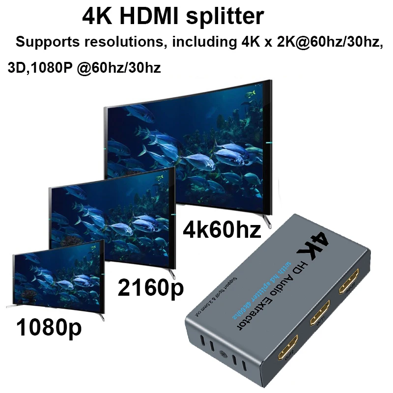 Estimado clienteGracias por comprar este convertidor. Para un mejor rendimiento y seguridad, lee atentamente estas instrucciones antes de conectar, operar o ajustar este producto. Guarda este manual como referencia en el futuro.IntroducirEste Extractor de Audio 4K HD con divisor HD no solo es un divisor HDMI, sino también un extractor de audio hdmi. Admite la distribución de 1 fuente HDMI a 2 pantallas HDMI, y también puede obtener audio a través de spdif y 3,5mm Conector individual al mismo tiempo. Tendrás más opciones para mostrar tu fuente de audio y vídeo. Además, soporta hasta 4K60hz, para que pueda ver sus películas favoritas, programas de TV, su colección de fotos en su totalidad HD.Especificaciones del producto1. Entrada: HDMI x 12. Salida: HDMI x 2,Spdif x 1,3.5mm jack x 13. Resolución: soporta hasta 4K60HZ, compatible con versiones anteriores.4. HDCP: HDCP1.4, compatible con versiones anteriores, no es compatible con HDCP2.2.5. compatible con HDMI1.4 y DVI1.0, compatible con versiones anteriores6. Soporta 30/36/48 bits de color profundo7. Tasa de muestra de salida de Audio 32khz-192khz8. Potencia: 5V CC9. Medidas: 90x47x19mm10: Peso neto: 95gContenido del paquete1. Unidad Principal (extractor de audio divisor 4k 1x2 HDMI)2. cable de carga USBNota:1 Este divisor de audio HDMI no es bidireccional y solo admite señal de dispositivos de fuente HDMI a pantallas HDMI.2 debe haber una entrada y salida de vídeo HDMI, el puerto de salida de audio óptico 3,5mm o SPDIF no se puede utilizar solo.3 El adaptador es solo un extractor divisor de vídeo y audio. No puede decodificar ni cambiar el formato de audio.4. Debe usar el cable USB adjunto para conectar el extractor con un puerto USB en su devce o un adaptador de corriente de 5V CC (el paquete no tiene el adaptador de corriente).