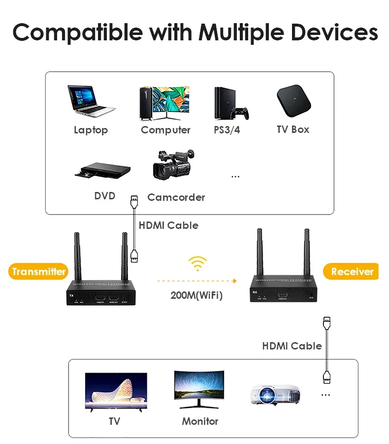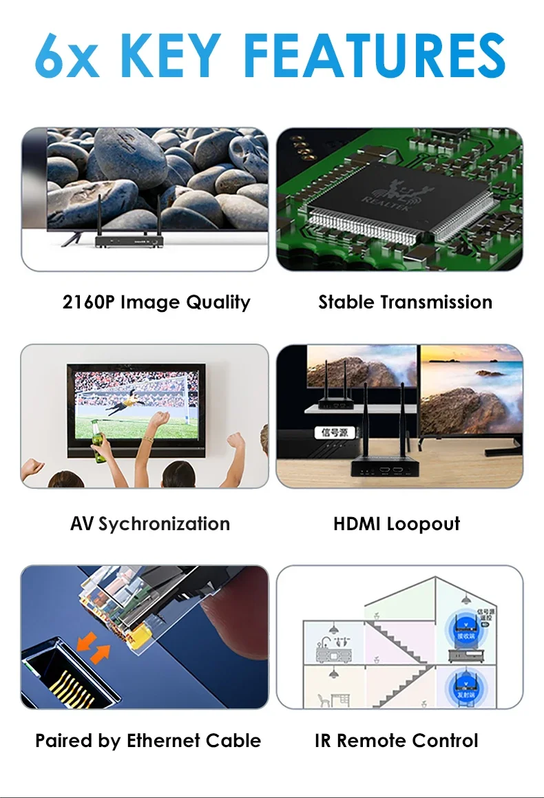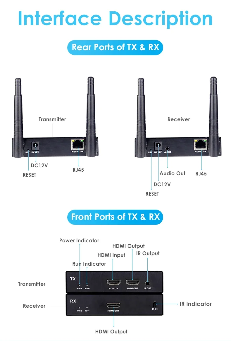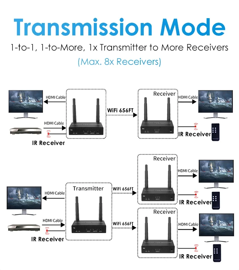 Salida de señal1x salida HDMI por receptor; 1x salida IR por transmisor