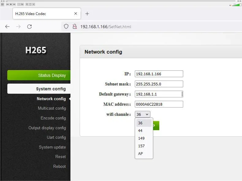 RedIP predeterminado192.168.1.166 (Transmisor); 192.168.1.167 (Receptor)