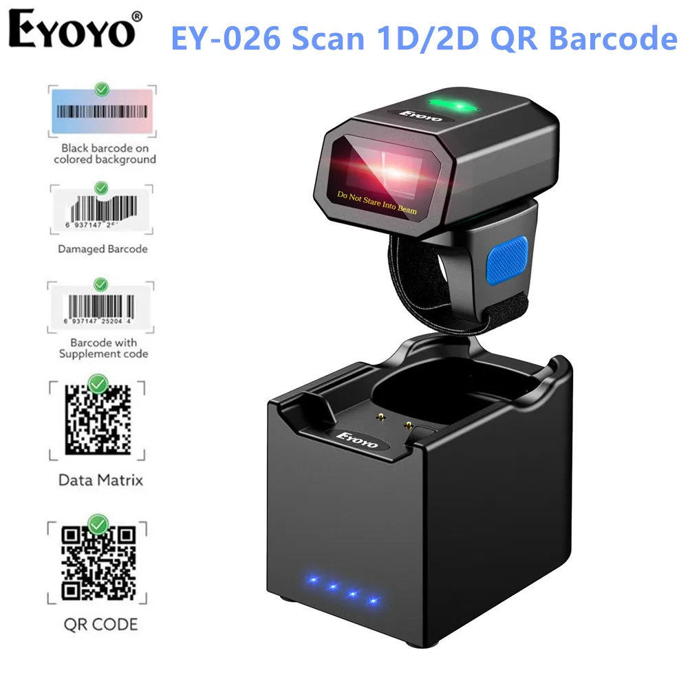 Comprar Eyoyo-escáner de código de barras de anillo inalámbrico 2D, Compatible con Bluetooth 2,4G, con cable, portátil, usable, Mini lector de código de barras de dedo