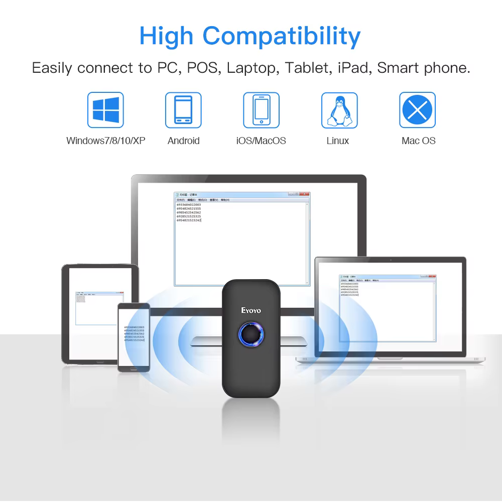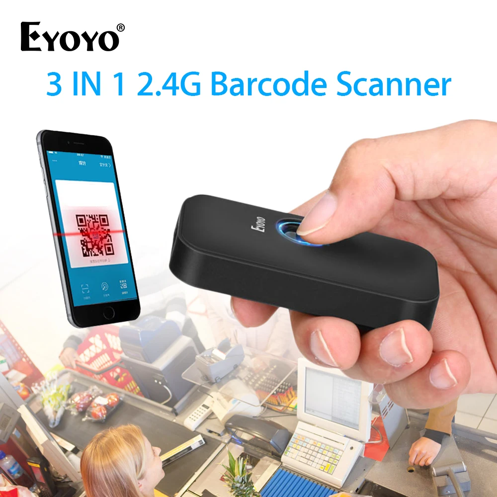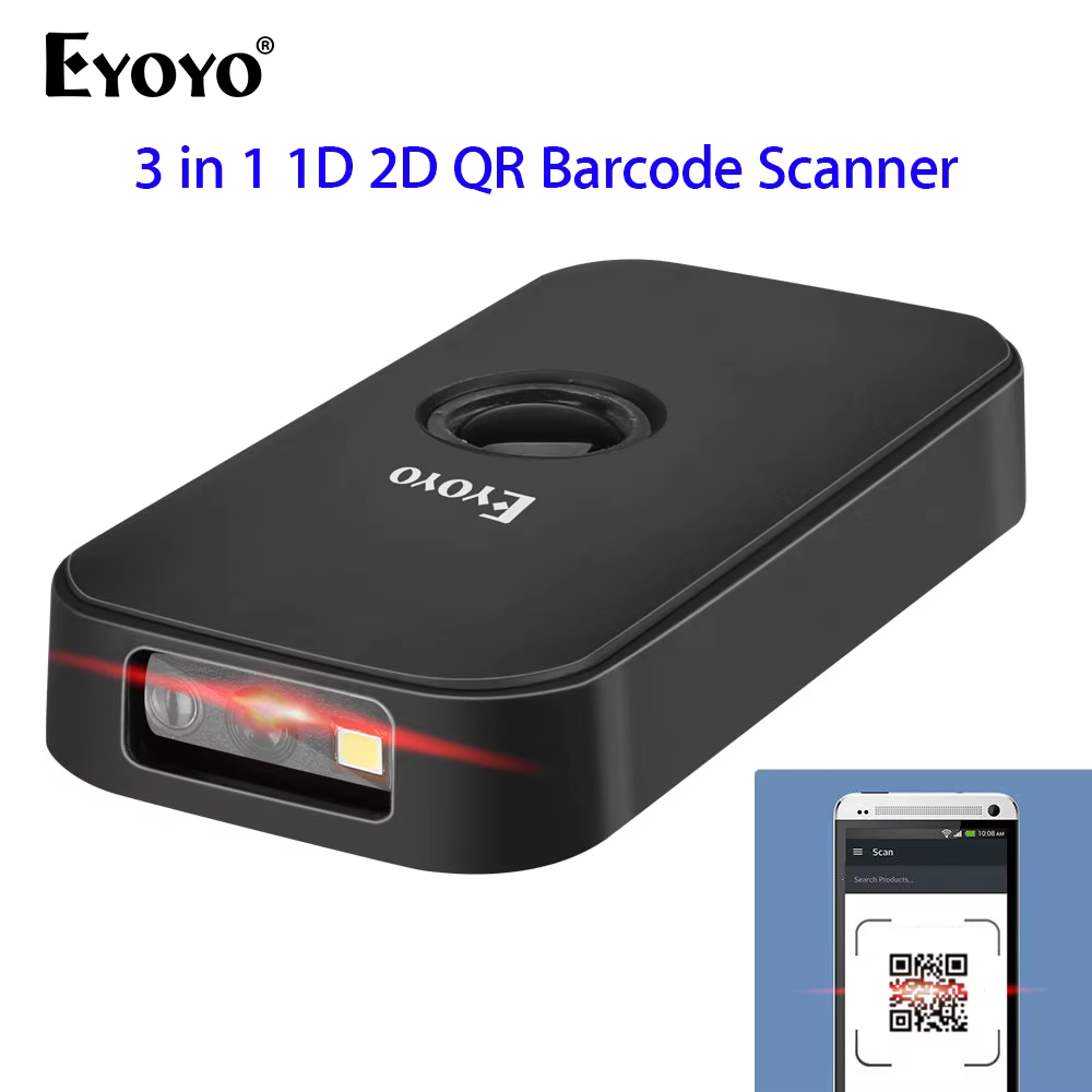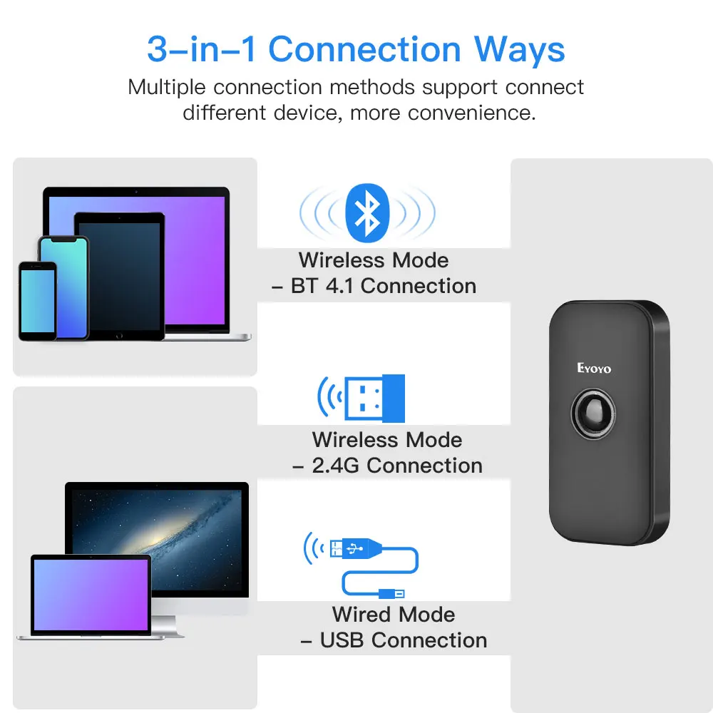 Eyoyo Mini Pocket Bluetooth 1D QR 2D barcode scanner with Bluetooth, 2.4G Dongle Wireless and Wired 3-in-1 Connection Modes. Powerful bar code decoding capabilities, long transmission range and long using time making it more attractive. what's more, completely mini pocket size and only 35g/1.23oz weight easily making this Eyoyo scanner ideal for you.