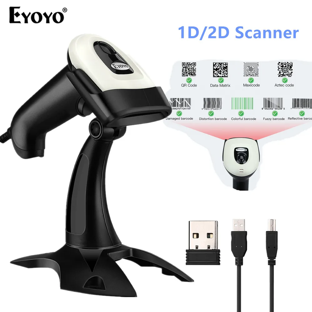 Comprar Eyoyo-escáner de código de barras con soporte, lector de código de barras de mano, inalámbrico, 2D, QR, Bluetooth 2,4G, con cable USB, Detección automática