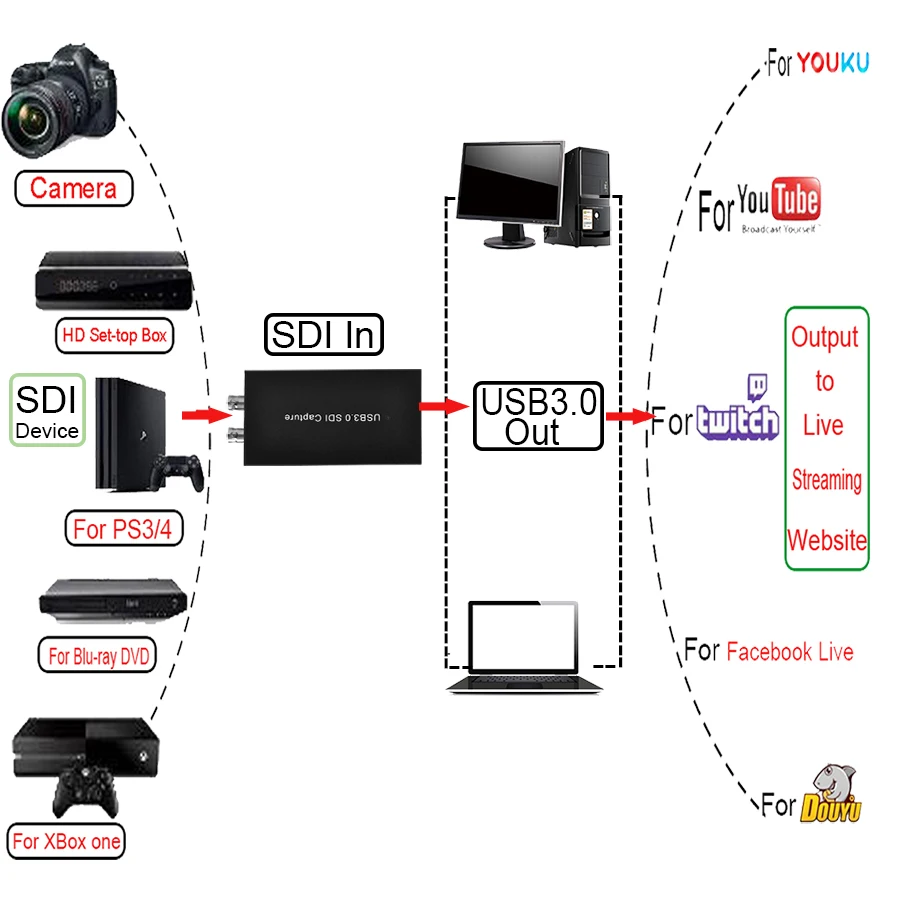 Dispositivos compatibles: Puede capturar fuentes de vídeo SDI HD. Adecuado para dispositivos con salida SDI como cámara HD, endoscopio médico HD, imágenes médicas, TV, Juego