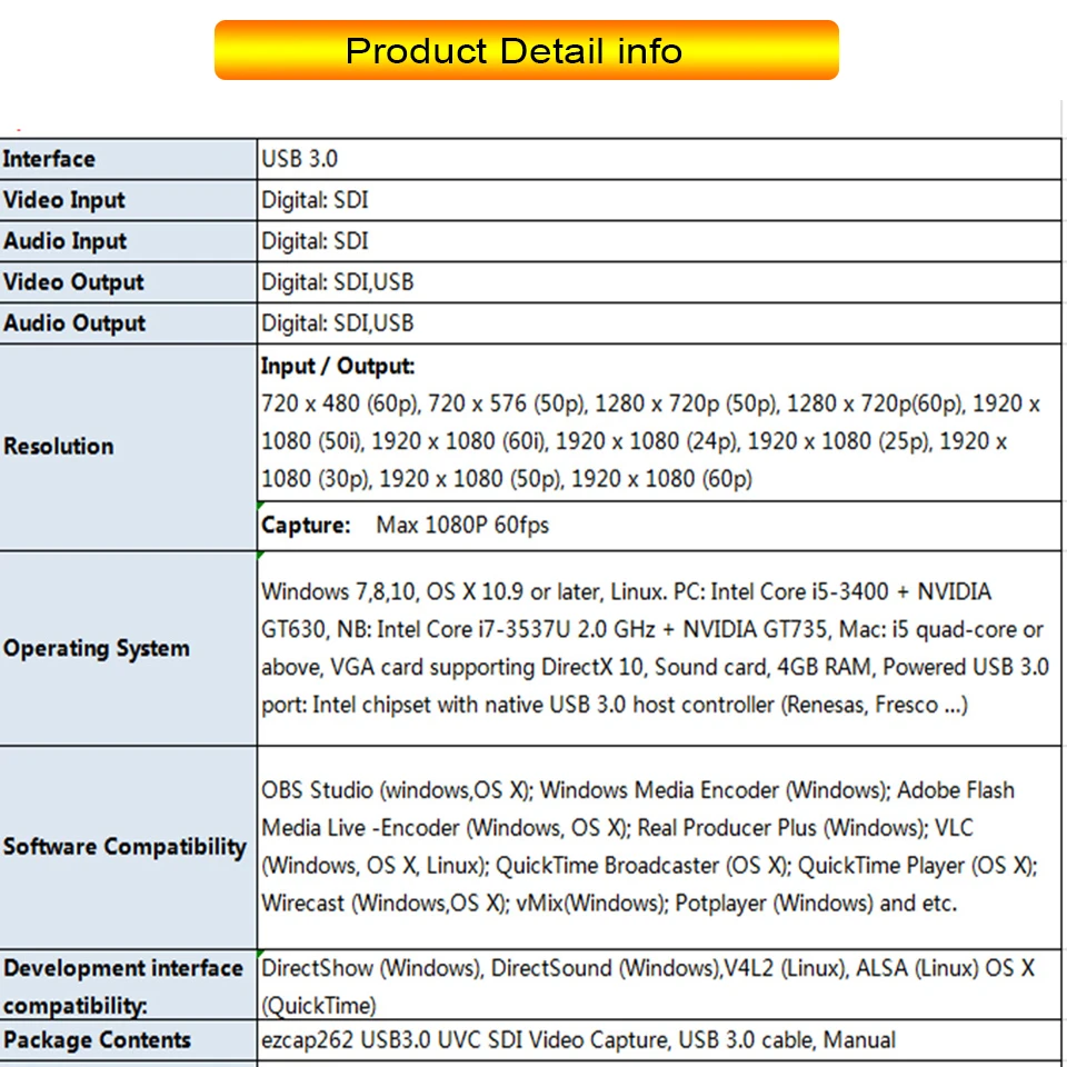 Características:【Captura de vídeo SDI a USB 3,0 】-- Basado en la tecnología USB 3,0 de alta velocidad, puede capturar fuentes de vídeo SDI HD. Adecuado para dispositivos con salida SDI como cámara HD, endoscopio médico HD, imágenes médicas, TV, Juego