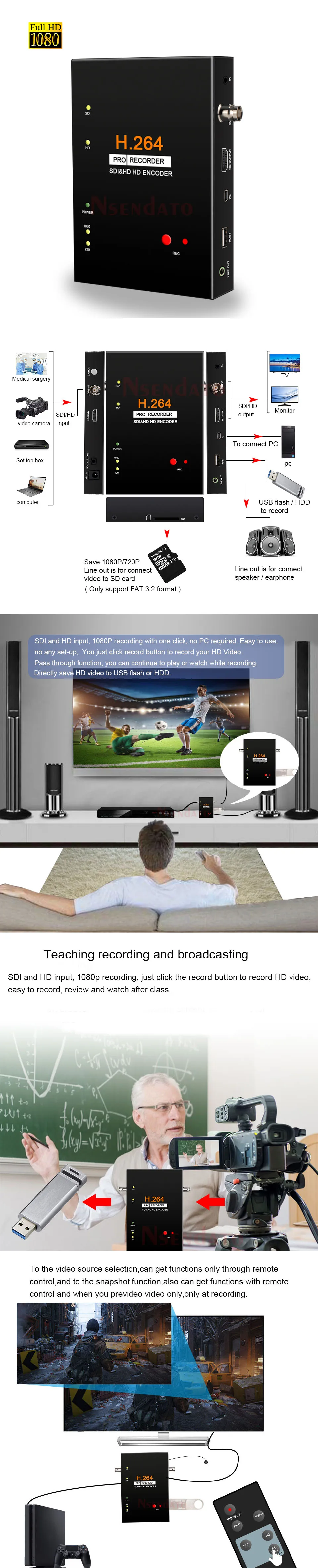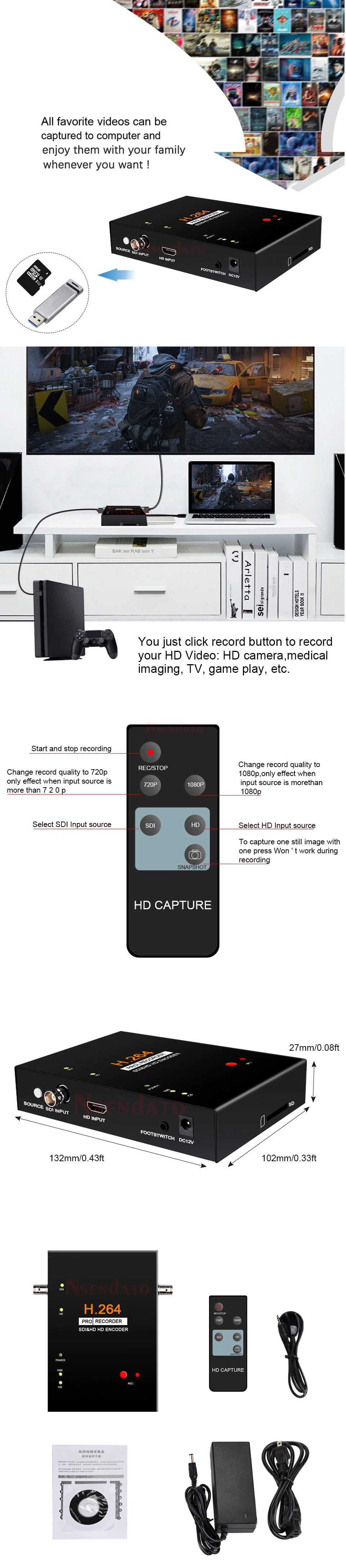 Video Input:HDMI-compatible, SDIAudio Input:HDMI-compatible, SDIVideo output:HD (Get via HD or SDI input), SDI (Get via SDI input)Interface Application:HD Port:Industrial HD camera video camera, HD medical endoscopes, set-top boxes, game, etc.SDI Port:Industrial HD camera video camera, HD medical endoscopes,etc.NOTE: HDCP protected content can not be recorded.Size:132*104*27mmWeight:375gStorage media:U disk, Mobile hard diskMax capacity: USB / 2TNote: Does not support exFAT formatSDI and HD input, 1080P recording with one click, no PC required. Easy to use, no any set-up. You just click RECORD button to record your HD Video: HD camera, medical imaging, TV, gameplay, etc. You can set the record quality between 720p and 1080p, and also with a button so you can choose input video manually.Directly save HD video to USB flash or HDDWith SDI and HD input and output pass through.With remote control, you can operate with remote. Also with a remote expand cable, so can set the device inside a metal case and can remote control it at same time.Remarks: to the video source selection,can get functions only through remote control,and to the snapshot function,also can get functions with remote control and when you prevideo video only,only at recording.Specifications:1. SDI and HD input, 1080P recording with one click, no PC required.2. Easy to use, no any set-up. You just click RECORD button to record your HD Video: HD camera, medical imaging, TV, game play, etc.3. Remote control with Screen Shot button.4. Pass through function, you can continue to play or watch while recording.NOTE: please note that you can NOT play recorder videos on this device, you can ONLY record to your storage device (USB key, hard drive), to play the recorded files, you need to take your storage media out of the device to a computer or media player.Package Include:1 x Nsenato 286 HD Video Capture1Xremote control(NO battery included.) 1XDC Adapter 1XCD![]()