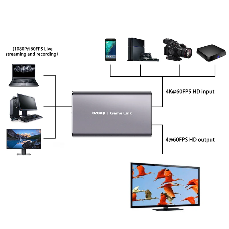 Entrada y salida de señales HDMI 4K 60HZ, y captura o transmisión en directo de vídeos de hasta 1080P 60fps.