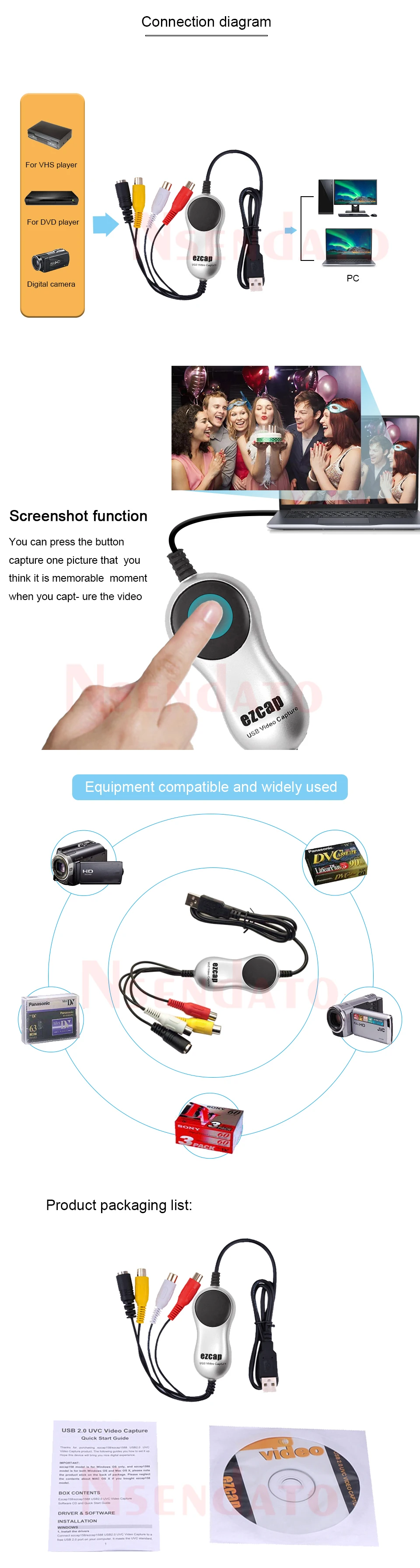 Ahora el CD se ha eliminado, por lo que proporcionamos el enlace para descargarlo. Ahora tiene todas las opciones que necesita para grabar sus películas favoritas, programas de televisión o vídeos reales desde una fuente de vídeo analógica en su ordenador. Y edítelos, grabe discos DVD, conviértalos y envíelos a su iPod, PSP o teléfono móvil 3GP. Para que pueda verlos en cualquier lugar y en cualquier momento. Características: Nuevo y de alta calidad Producto ezcap 100% original y genuino * Conecta dispositivos de vídeo, como VHS, V8, Hi8, videocámara, cámara DSLR, para Xbox, PS3 y más a su PC y convierte el vídeo analógico a formato digital. * Permite transferir vídeos desde tu ordenador a iPad, iPhone, iPod Touch, dispositivos Android y más, Para que pueda verlos en cualquier momento y en cualquier lugar. * Hace que sea fácil compartir tus videos clásicos en YouTube, FaceBook, etc. * Incluye software editor de vídeo profesional y fácil de aprender y de usar con las claves de licencia: ArcSoft Showbiz 3,5 para PC. * Conectividad estándar RCA compuesta y S-Video. Alto Plug & Play. Alimentado por USB, no se necesita fuente de alimentación externa. Requisitos del sistema para PC: Un Puerto USB 2,0 disponible CPU Pentium4 o superior 512MB RAM o superior La tarjeta gráfica admite DirectX 9.0C 1GB de espacio libre en el disco duro Para la instalación /RW para grabar DVD Windows XP, Vista, 7, 8, 10 Nota 1: Tal vez tenga que comprar un cable de vídeo y audio, y un cable S-Video para conectar la captura de vídeo USB con Su dispositivo de vídeo analógico. Necesita comprar el adaptador de vídeo/audio Scart si la salida de su dispositivo fuente de vídeo es Tipo Scart. Nota 2: Los siguientes dispositivos se pueden utilizar como fuentes de vídeo analógicas: grabadora de vídeo, reproductor de DVD, cámara de vídeo, Decodificador, reproductor de juegos y cualquier dispositivo que proporcione una señal de vídeo analógica. Especificaciones: Número de modelo: 170 Interfaz: USB 2,0 estándar Entrada: Video compuesto (RCA), S-Video (miniDIN 4pin), Audio L/R (RCA) Sistema de TV: PAL, NTSC Resolución: NTSC 160*120-720*480, PAL 160*120-720*576 Velocidad: NTSC 30fps, PAL 25fps Software de edición/conversión: ArcSoft Showbiz 3,5 Formato de grabación: MPEG2 Formato de conversión: Para iPod, 2. °, 2. °, 3 GP-MPEG4, 3. °, 2. °, 2. °, 2. °, 2. °, 3. °, 3. °, 3. °, MPEG4, 3. °, 3. °, etc. Fuente de alimentación: Bus USB Potencia consumida: ≤ 1,5 W Paquete incluido: 1 * dispositivo de captura de vídeo 1 * Manual