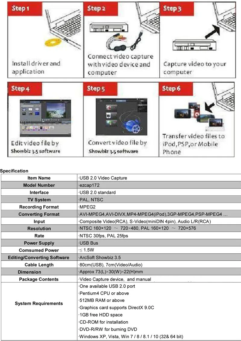 El paquete incluye-Tarjeta de captura de vĂdeo USB Ezcap 172 para Windows X1