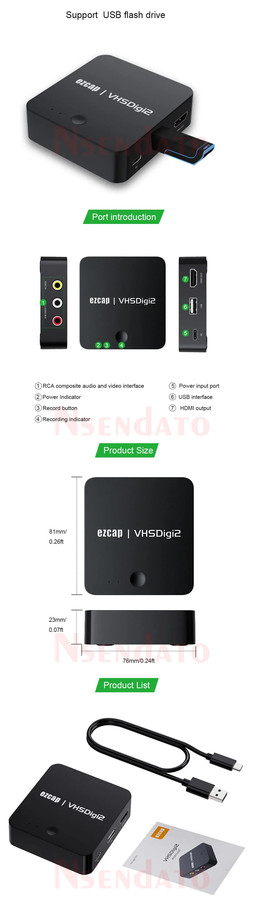 Especificación Interfaz: USB 2.0 Entrada de vídeo: vídeo compuesto RCA Entrada de audio: audio analógico L/R RCA Salida de vídeo: HDMI Salida de audio: HDMI Interfaz de usuario: botón RECORD/STOP, LED indicador de encendido y grabación. Medios de almacenamiento: unidad USB.Admite FAT32 y NTFS, y exFAT no es compatible. Formato de grabación:mp4 Calidad de grabación: NTSC: 720 x 480p@30fps, PAL:720 x 576p@25fps Archivo de grabación: máx. 1,6 GB/NTSC, 1,95 GB/PAL por archivo, aproximadamente 920 MB/hora. Fuente de alimentación: cable de alimentación USB-C a USB-A (no incluye adaptador de corriente 5V2A) Característica Graba y digitalize videos desde su VHS, Hi8, videocámara, DVR, reproductor de DVD, etc.con un clic, no se requiere PC. Con salida de bucle HDMI, puede conectarlo a un televisor para monitorear vídeo durante la grabación. Paquete: Tarjeta de captura de vídeo Ezcap181 Cable de alimentación USB Guía del usuario