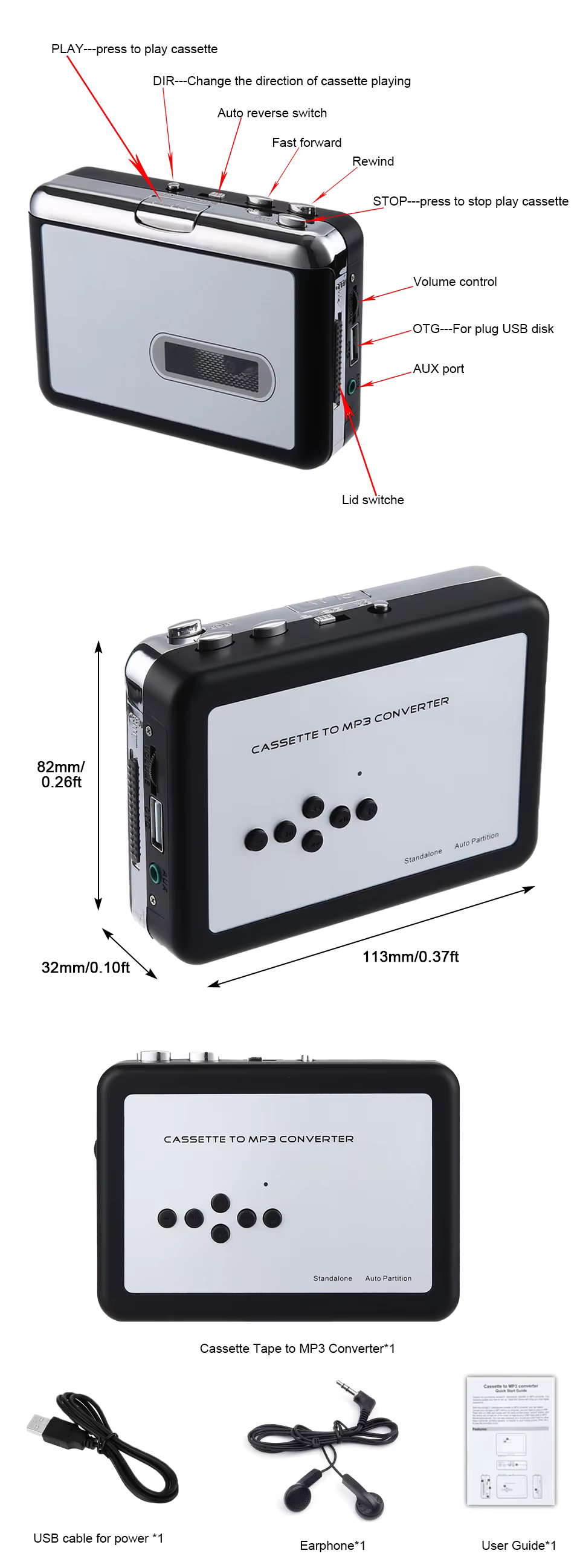 Multifunctional converter. It can be used as for walkman, listen to the cassette/tape with headphone, speaker, car stereo. Just plug the 3.55mm AUX jack into converter, then enjoy the sound memory.