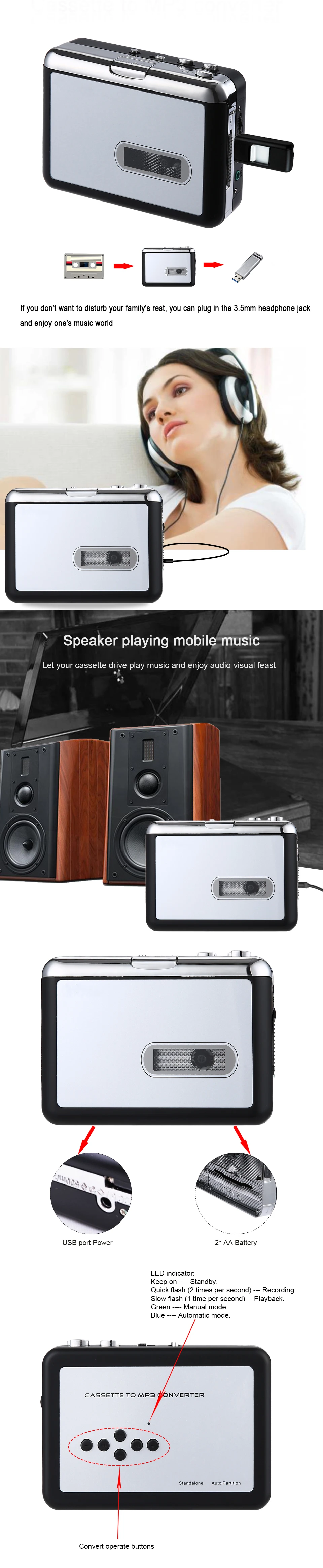 Converting cassette/tape to MP3 format into thumb drive automatically without any other device. Never go out and find the audio editor to record again, you are the expert with this converter.