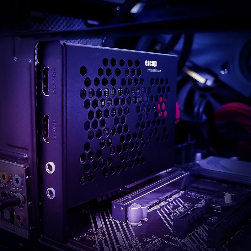 Retire la cubierta de la PC.Después de identificar una ranura PCle, desenrosque el pequeño metalbracket adjunto a la carcasa de la computadora directamente detrás de la ranura PCle.Suave pero firmemente, deslice la tarjeta de captura de video en la ranura PCle, asegurándose de que esté completamente bloqueada.Atornille la placa en la parte posterior de la caja para que las entradas y salidas están expuestos en la parte posterior de la carcasa de la computadora. Coloque el panel en la carcasa, vuelva a colocar los tornillos y sosténtelo en posición vertical. Vuelva a conectar todos los cables al estuche.Encienda la PC. El sistema reconocerá automáticamente la tarjeta de captura del juego y verá el nombre del dispositivo. ezcap LIVE GAMER RAW en el Administrador de dispositivos, lo que significa que el dispositivo está listo para funcionar.