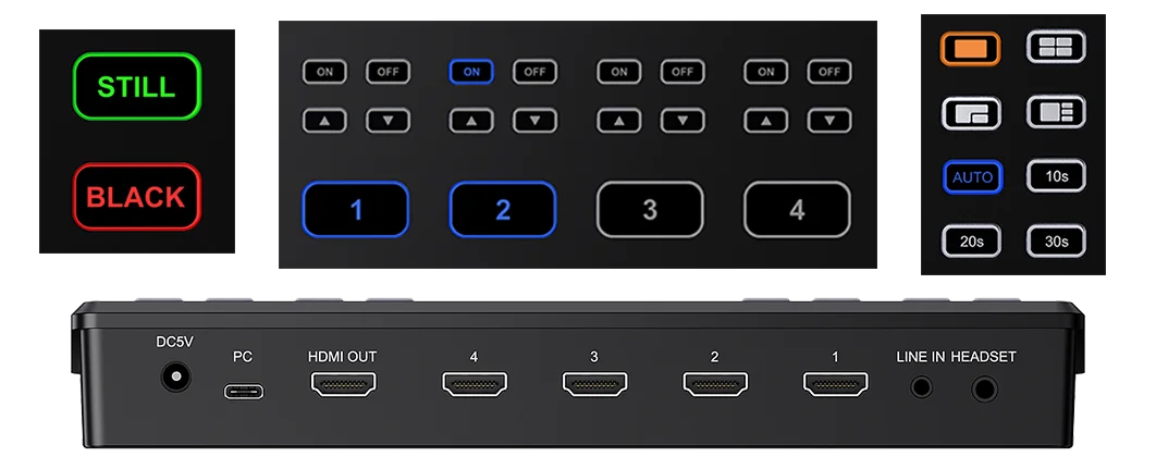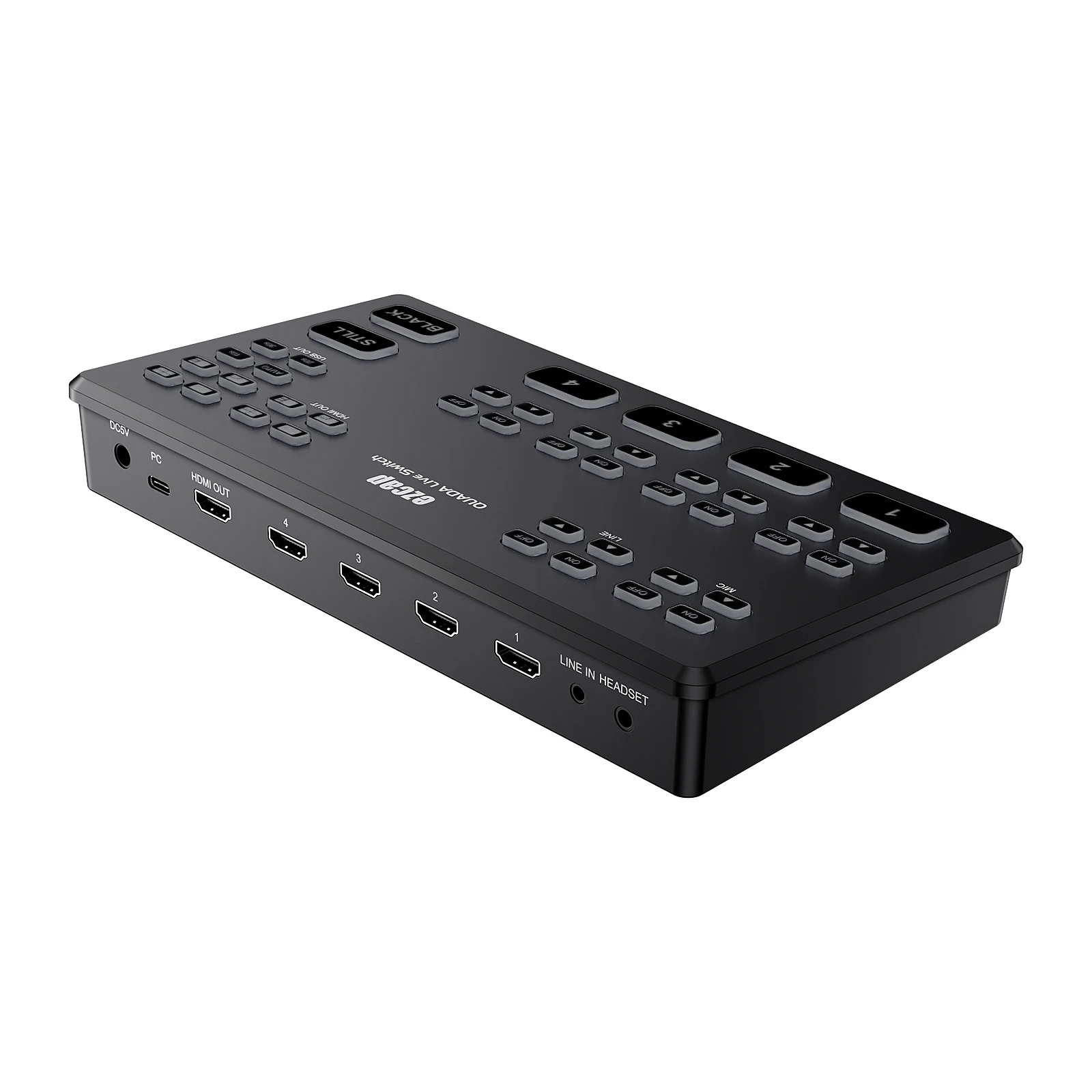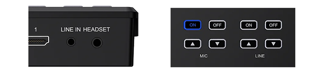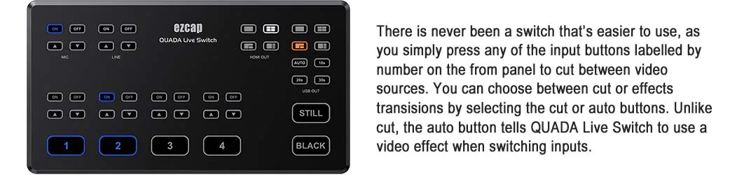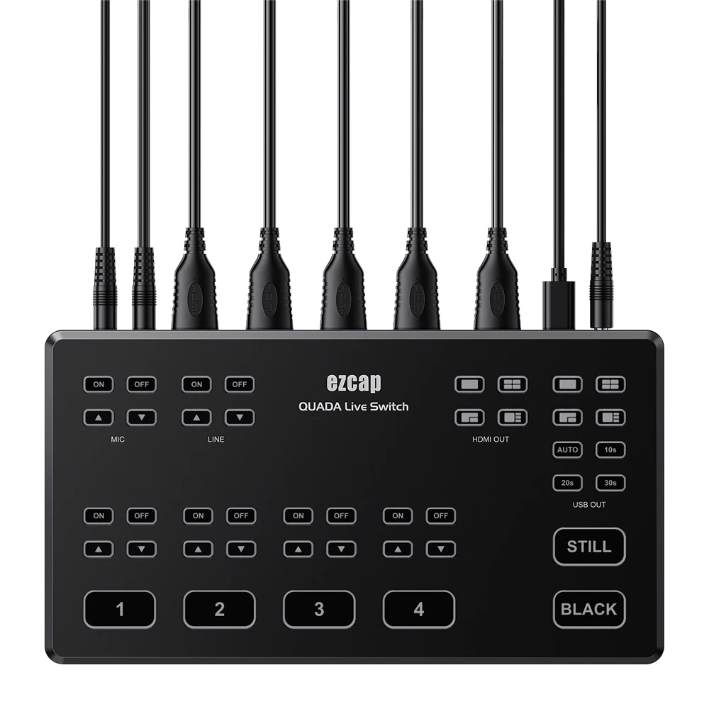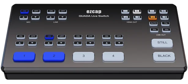 Con dos entradas de audio estéreo independientes de 3,5 mm, puede conectar un micrófono de solapa e incluso puede conectar un reproductor de música para generar introducción de música después de que comience la transmisión en vivo, pero antes de que comience el programa.Todas las entradas de audio del ezcap QUADA Live Switch incluyen botones en el panel para ajustar el nivel de audio y habilitar las entradas en el mezclador de audio.El ezcap QUADA Live Switch cuenta con un mezclador de audio con todas las entradas HDMI y ambas entradas de micrófono y línea están conectadas al mezclador de audio para que pueda mezclar en vivo desde todas las fuentes de audio.El ezcap QUADA Live Switch también incluye una salida para auriculares.