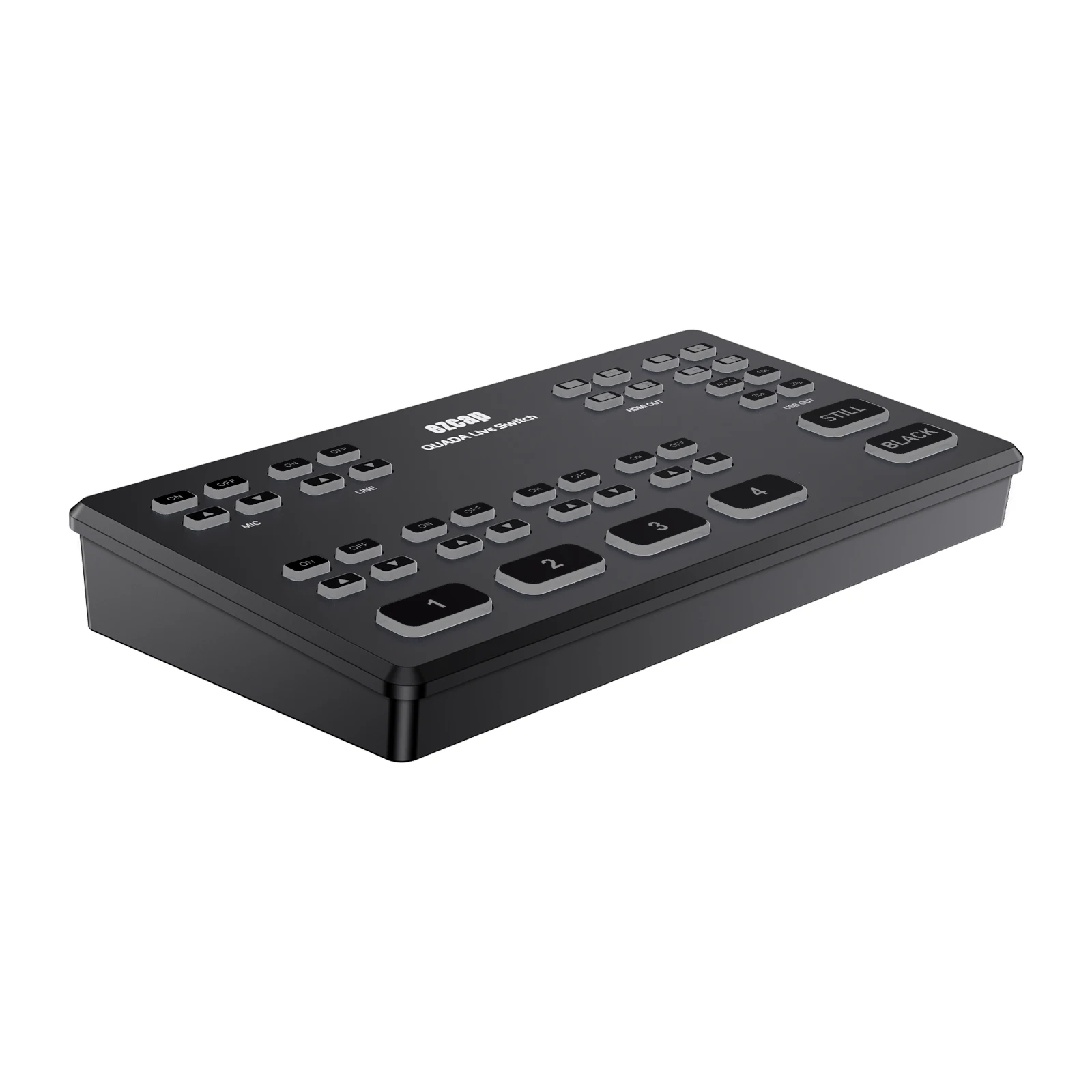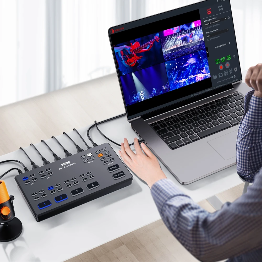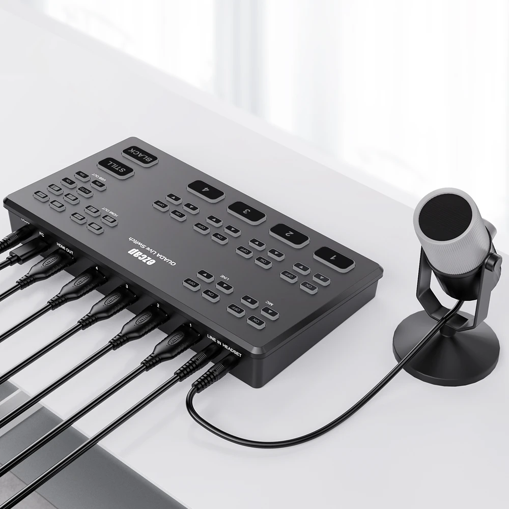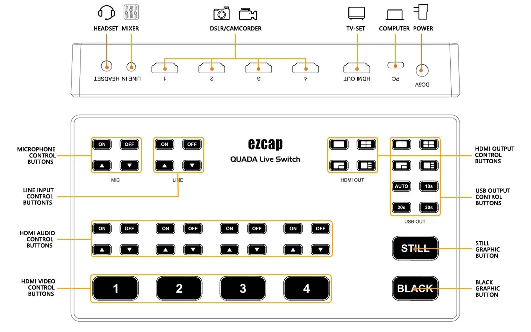 Con dos entradas de audio estéreo independientes de 3,5 mm, puede conectar un micrófono de solapa e incluso puede conectar un reproductor de música para generar introducción de música después de que comience la transmisión en vivo, pero antes de que comience el programa.Todas las entradas de audio del ezcap QUADA Live Switch incluyen botones en el panel para ajustar el nivel de audio y habilitar las entradas en el mezclador de audio.El ezcap QUADA Live Switch cuenta con un mezclador de audio con todas las entradas HDMI y ambas entradas de micrófono y línea están conectadas al mezclador de audio para que pueda mezclar en vivo desde todas las fuentes de audio.El ezcap QUADA Live Switch también incluye una salida para auriculares.