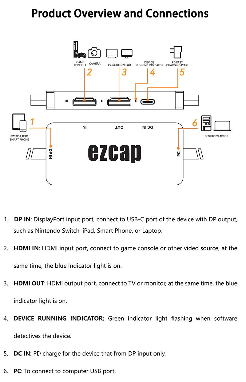 Gracias por comprar la tarjeta de captura de juegos ezcap377 GameLink DP. Puede utilizar este dispositivo: ingrese video HDMI o DP y emita video HDMI con una resolución de hasta 4KP30. y captura y transmite hasta 3840 x 2160p18, 2560 x 1440p30, 1920 x 1080p60 en computadora.