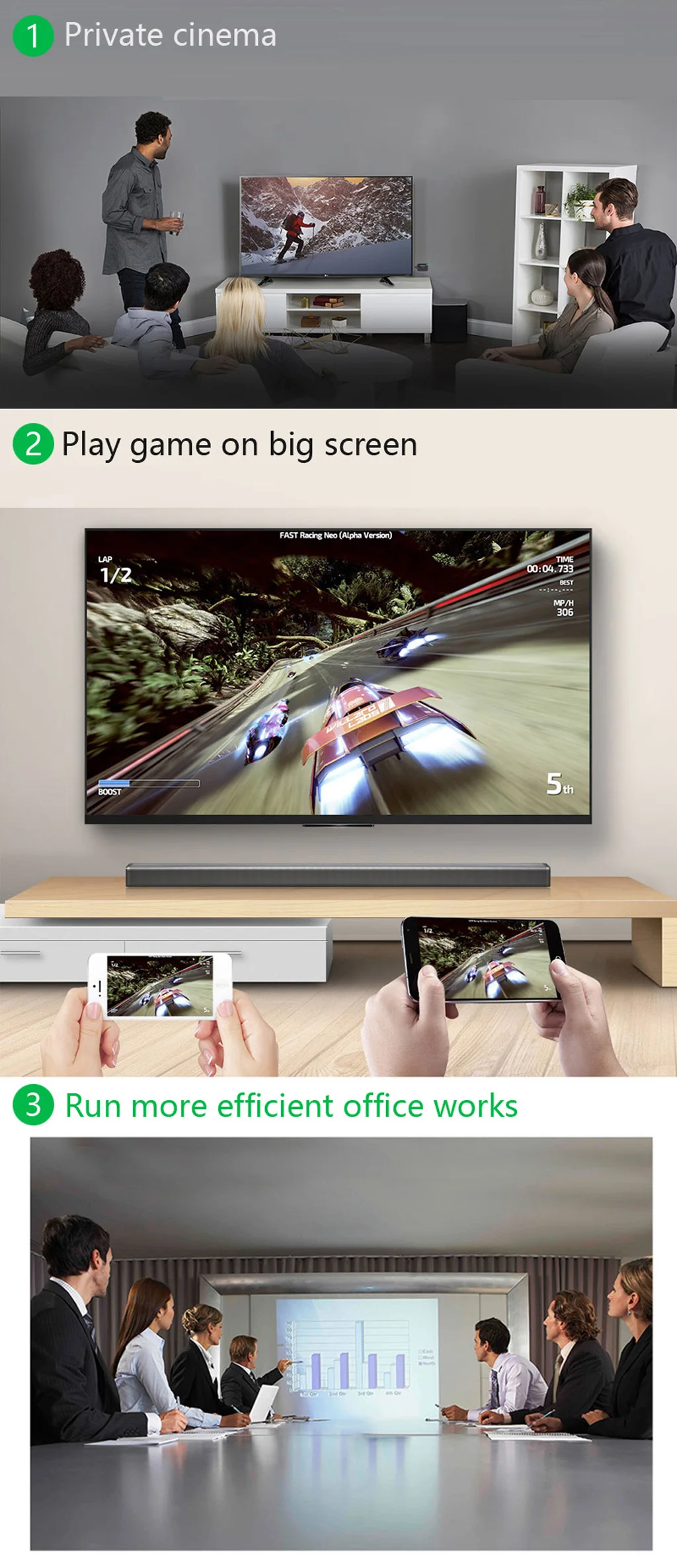 Puede mostrar el contenido de un teléfono inteligente en un HDTV (pero contenido protegido por derechos de autor, como Netflix/Disney +). .. No se puede jugar). Perfecto para el hogar o para llevar, solo llévelo con usted para disfrutar de tecnología avanzada.
