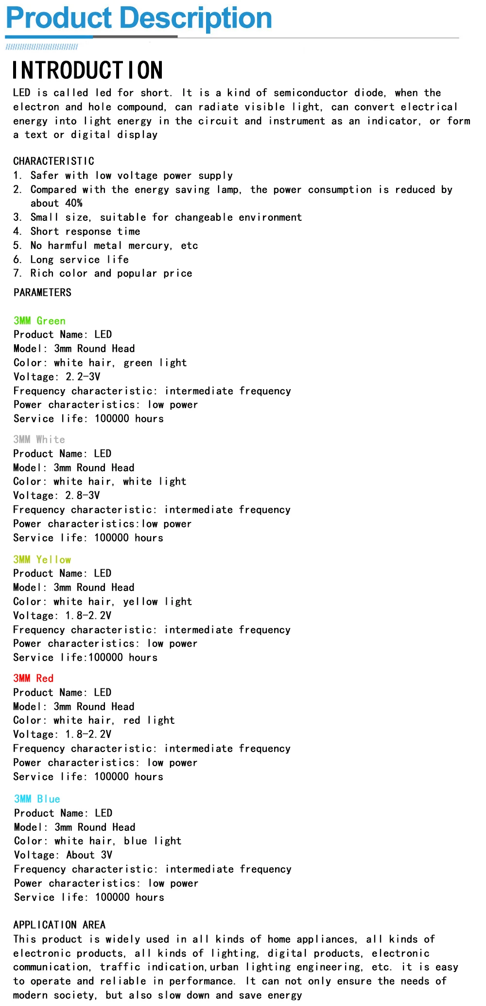 Tal como se describe, leds de 3mm con 5 combinaciones de colores, probados y funcionan adecuadamente.
