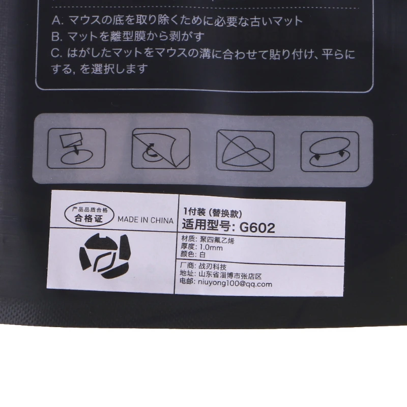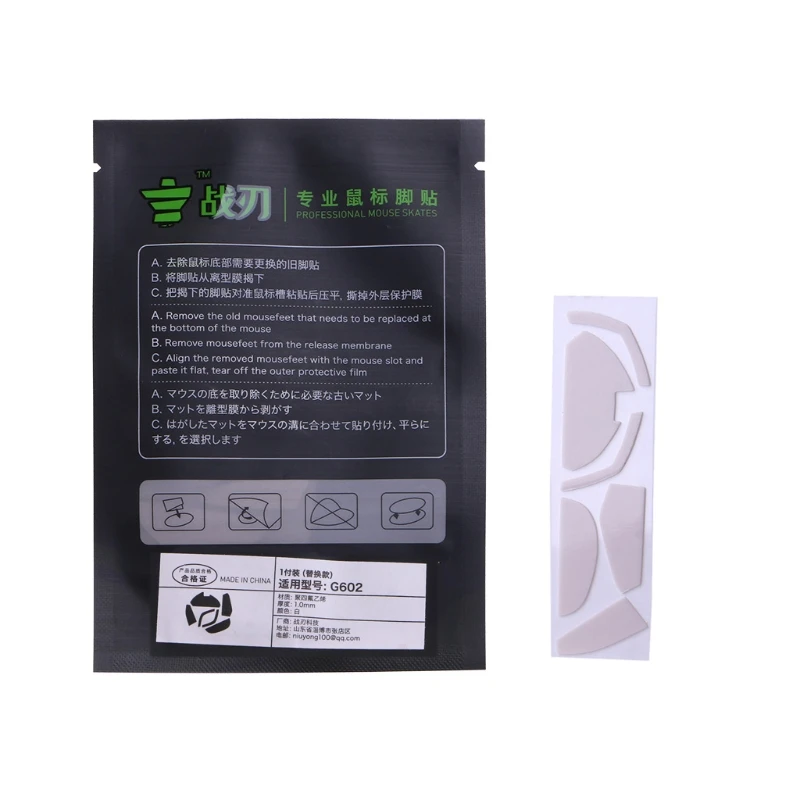 Nota:Este producto es un pie de ratón de repuesto. Después de quitar la pegatina original del pie del ratón, limpie la parte inferior de la cáscara con el algodón de alcohol que se adjunta en el paquete y luego pegue los nuevos pies del ratón.