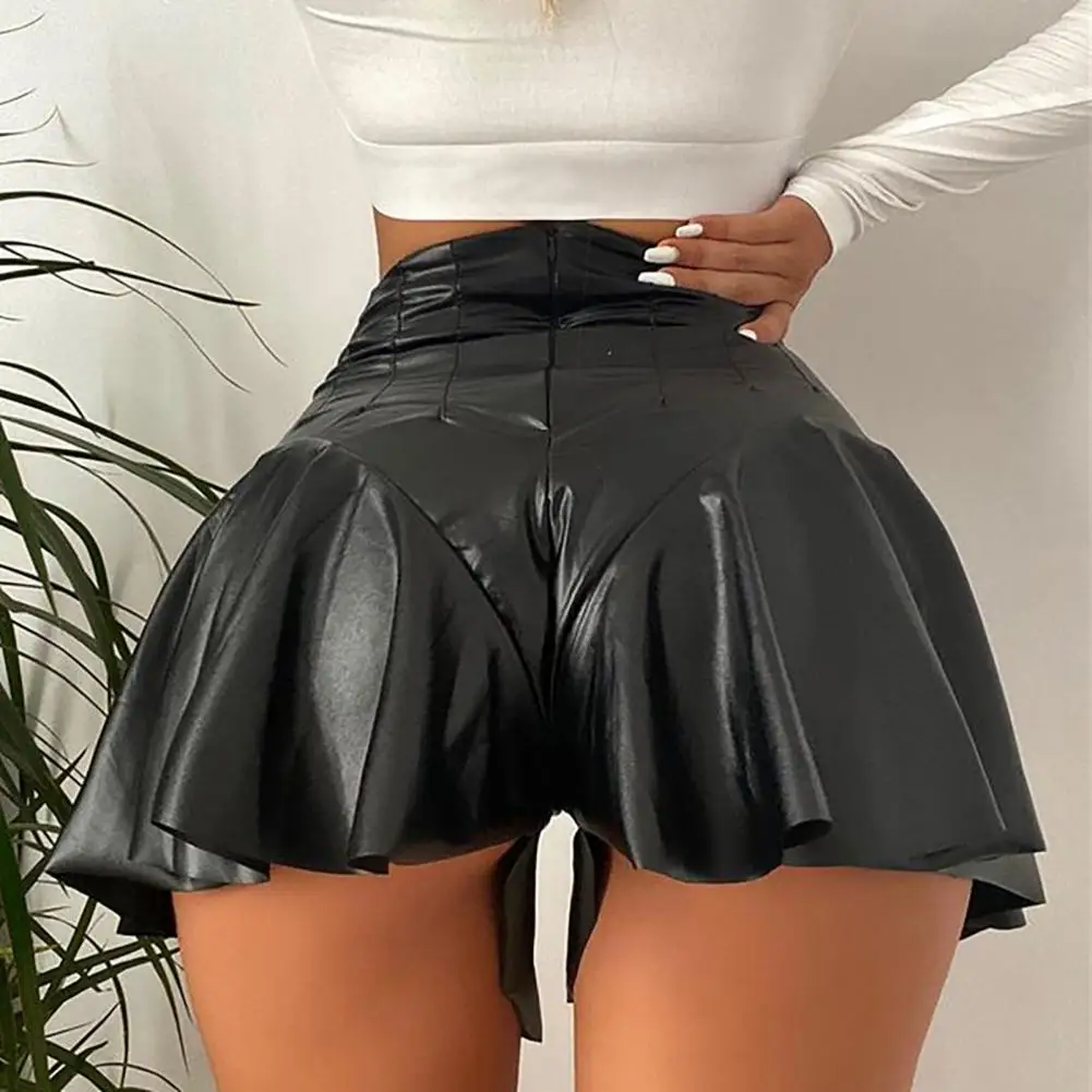 Falda de cuero de imitación Pantalones cortos de cintura alta All Match A-Line plisado volantes Mini falda pantalones cortos para Club