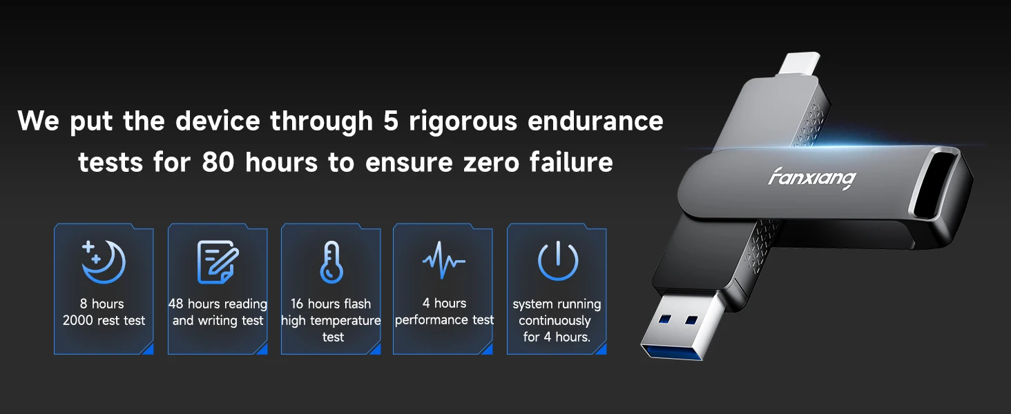 Unidad flash Fanxiang F951 equipada con una interfaz USB 3.2 Gen 2×2 y chips controladores SSD avanzados, nuestra unidad flash logra velocidades de lectura/escritura notables de 2000 MB/s y 1700 MB/s.Imagine que su unidad de pulgar transfiere 2 GB de datos en solo un segundo: no más esperas agonizantes y mejore en gran medida la eficiencia del trabajo.Tenga en cuenta que su dispositivo admite USB 3.2 gen 2×2 tipo c; de lo contrario, el rendimiento puede ser menor.