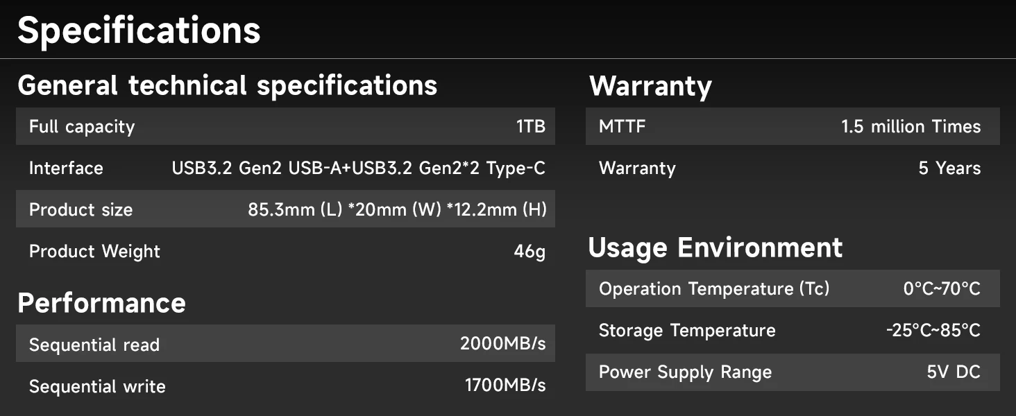 Sistema compatible: para Windows/Mac OS 10.9 y posterior/Linux/AndroidTamaño: 85,3*20*12,2mmPeso: ≈54 gGarantía: 5 añosContenido del paquete: