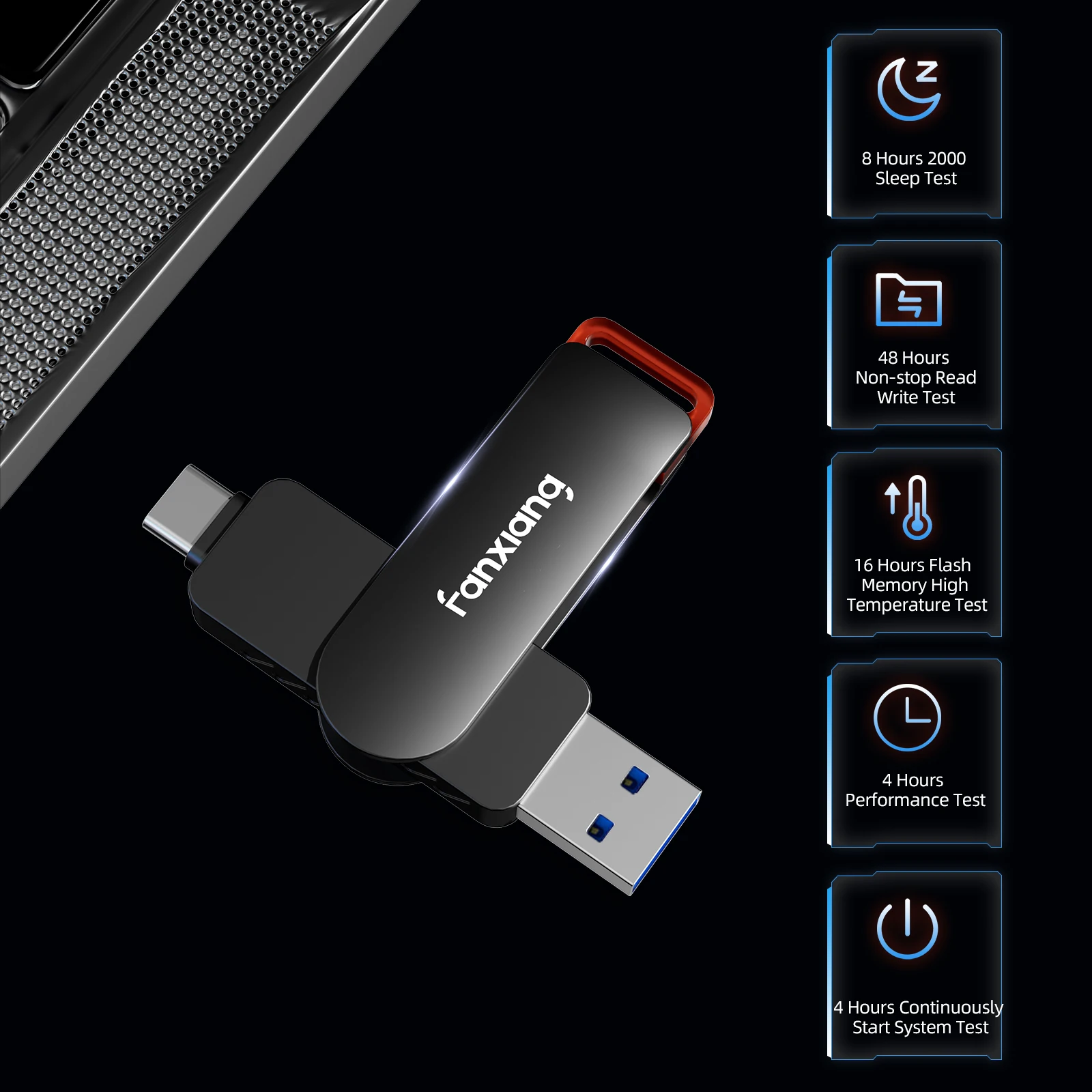 No necesita cable, conéctelo y juegue libremente.Con USB-C y un USB-A 3.2 puertos para intercambio de datos sin esfuerzo entre teléfono inteligente/tableta y computadora, la unidad USB fanxiang de 512 GB tiene una amplia compatibilidad. Adecuado para todos los dispositivos OTG tipo C como teléfonos inteligentes Android, iPad pro, iPhone 15, macbook, etc. y todos los USB convencionales. Equipo informático con puerto A, como TV inteligente, audio para automóvil, funciona con flexibilidad gracias al USB 3.2 compatibilidad con versiones anteriores.