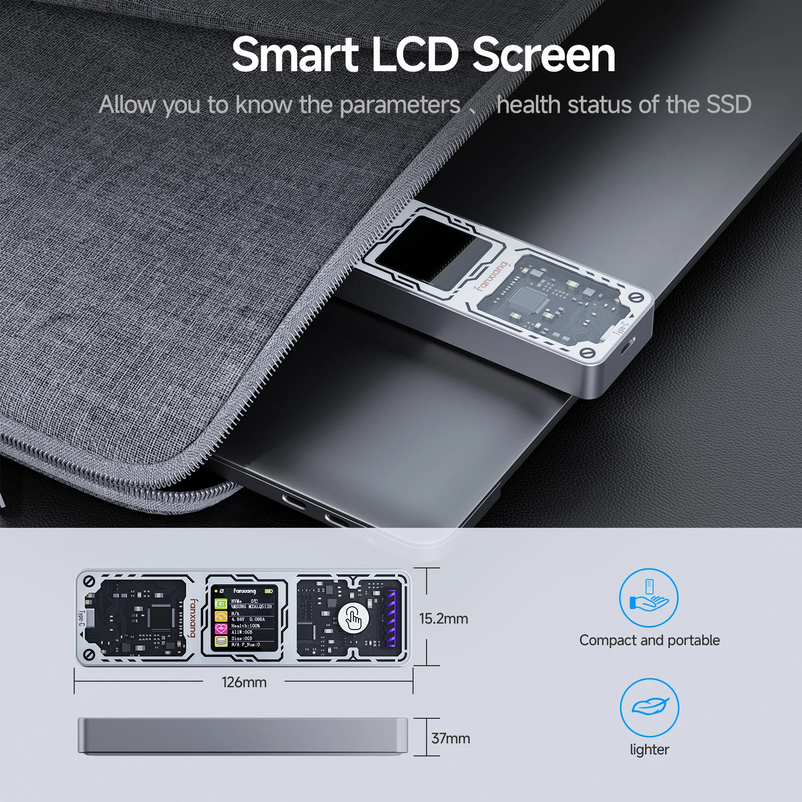 La pantalla inteligente le permite monitorear los parámetros clave y el estado de salud del SSD, brindando una experiencia plug-and-play fácil de usar sin necesidad de controladores.Ofrecemos una garantía de calidad de 3 años para la carcasa SSD fanxiang MD86, no dude en comprar con confianza