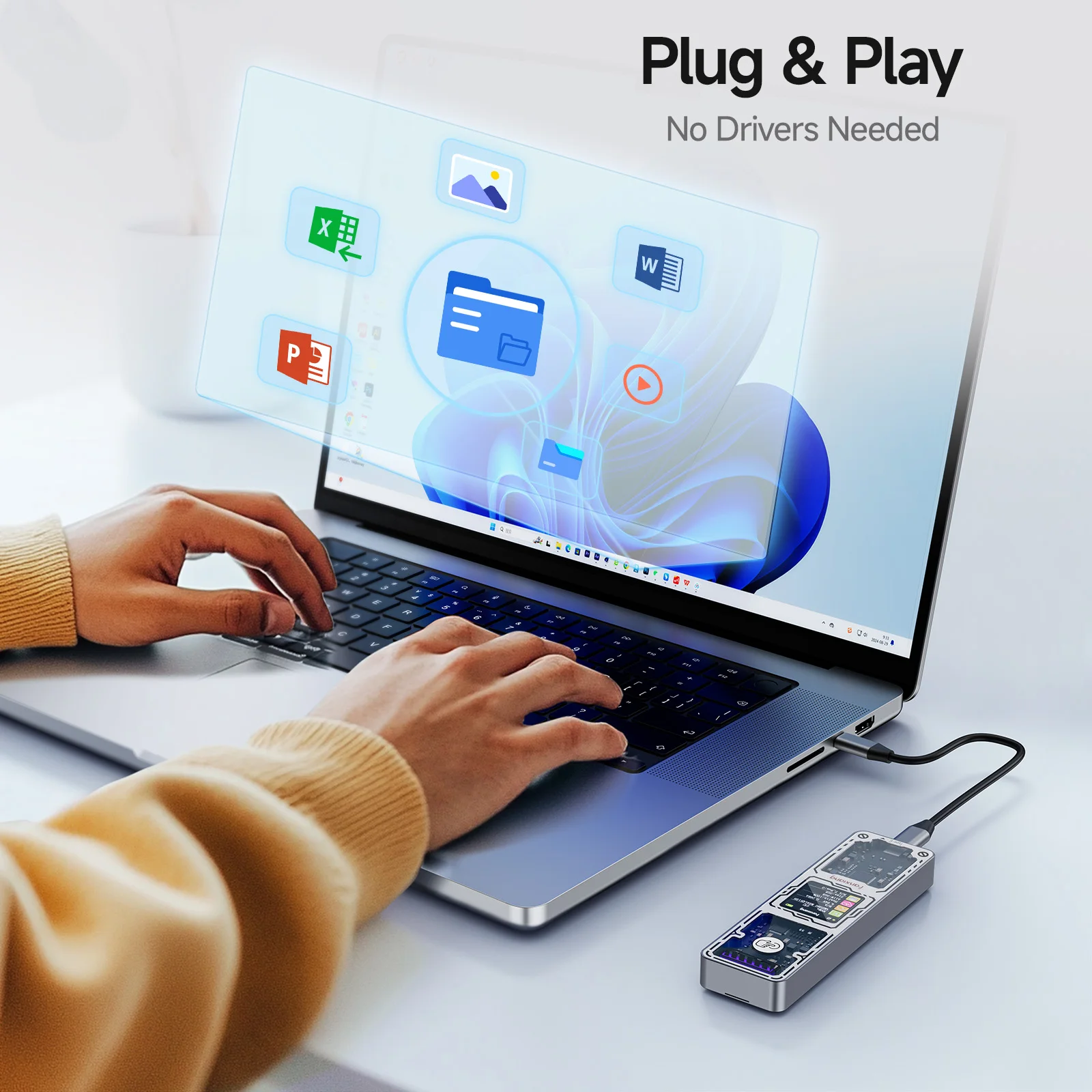 Esta carcasa M.2 admite protocolos NVMe y SATA, teclas B+M y M y SSD de tamaño 2230/2242/2280 de hasta 4 TB.Es compatible con una variedad de dispositivos, incluidos computadoras portátiles, de escritorio, televisores inteligentes tradicionales, PS5/PS4 (Pro), Xbox Series, Macs, Windows 7 y superiores, así como teléfonos inteligentes Android seleccionados con funcionalidad OTG