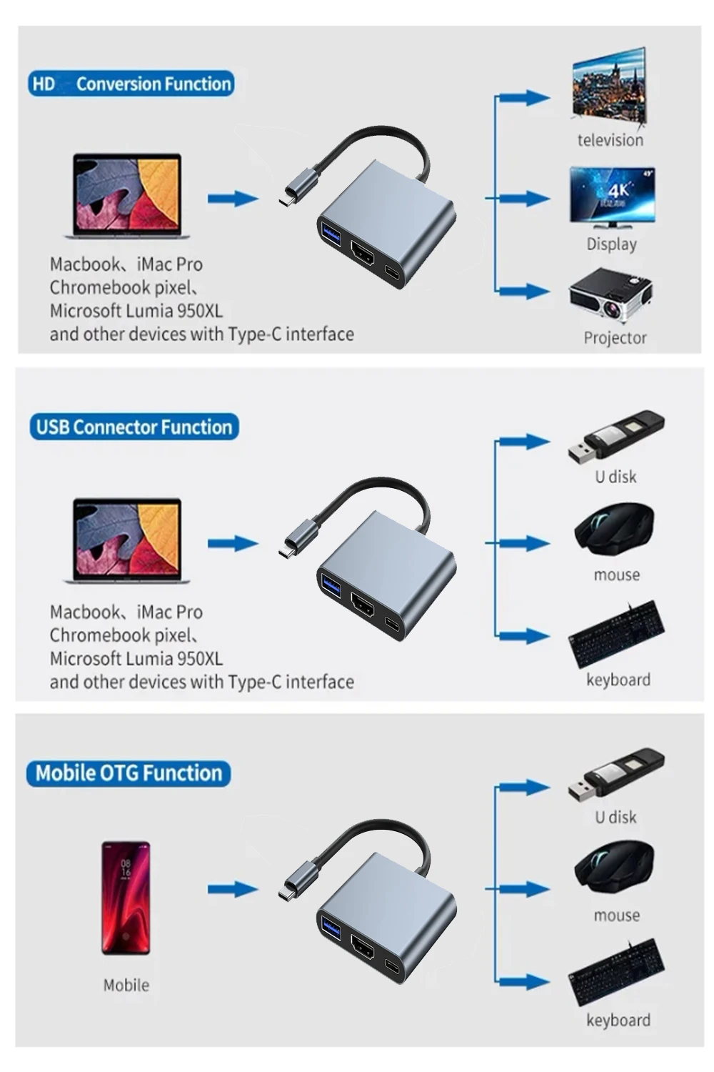 Este es un Hub de puerto de carga tipo C a USB 3.0 compatible con HDMI y tipo C.El USB 3.0 puerto le permite conectar un dispositivo USB a una computadora host u otro concentrador, el puerto USB-C hembra puede cargar la computadora host y el puerto compatible con HDMI (modo DP Alt) le permite conectar un monitor adicional para que Puedes ver vídeos o presentaciones de diapositivas en una pantalla grande.Puede funcionar con MacBook y otros dispositivos compatibles con tipo C.