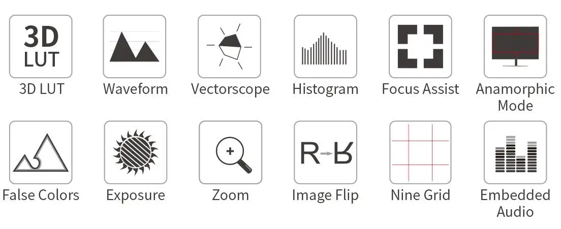 Nuestro sistema operativo flexible cuenta con un amplio conjunto de visores, todo con un solo toque y fácil de usar.El sistema operativo de vídeo incluye herramientas para enfoque, encuadre y exposición (forma de onda, desfile RGB, vectorscopio, histograma RGB, histograma, medidor de audio, pico de enfoque, zoom, cebra, color falso, guías de fotogramas, área segura, etc.)junto con una implementación 3D LUT flexible (use LOG incorporado para video Rec.709 o cargue archivos.cube), monitoreo HDR y opciones para monitoreo anamorfico de descrempresión.