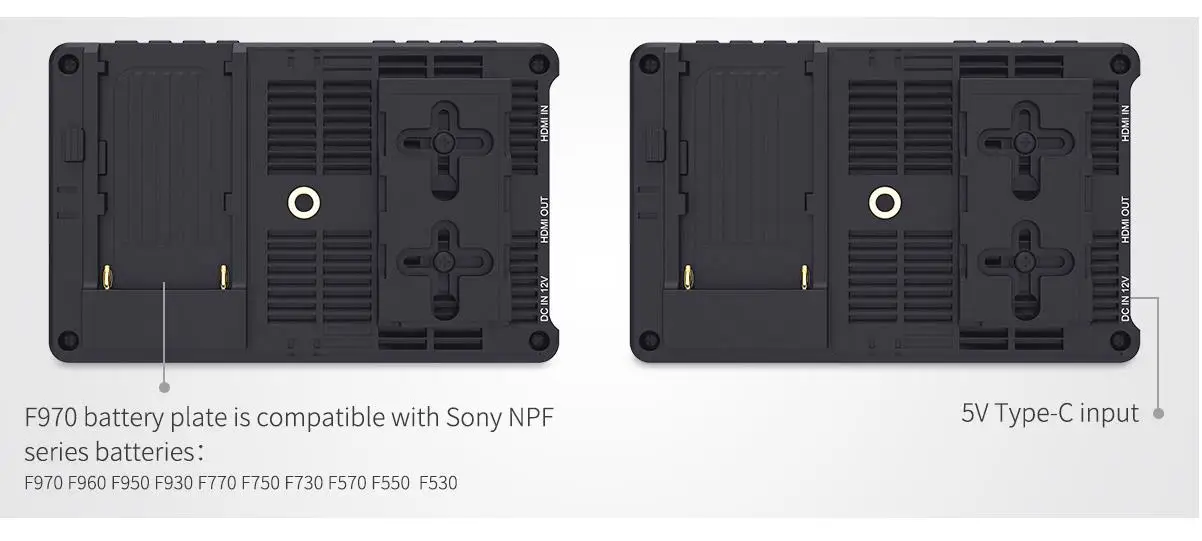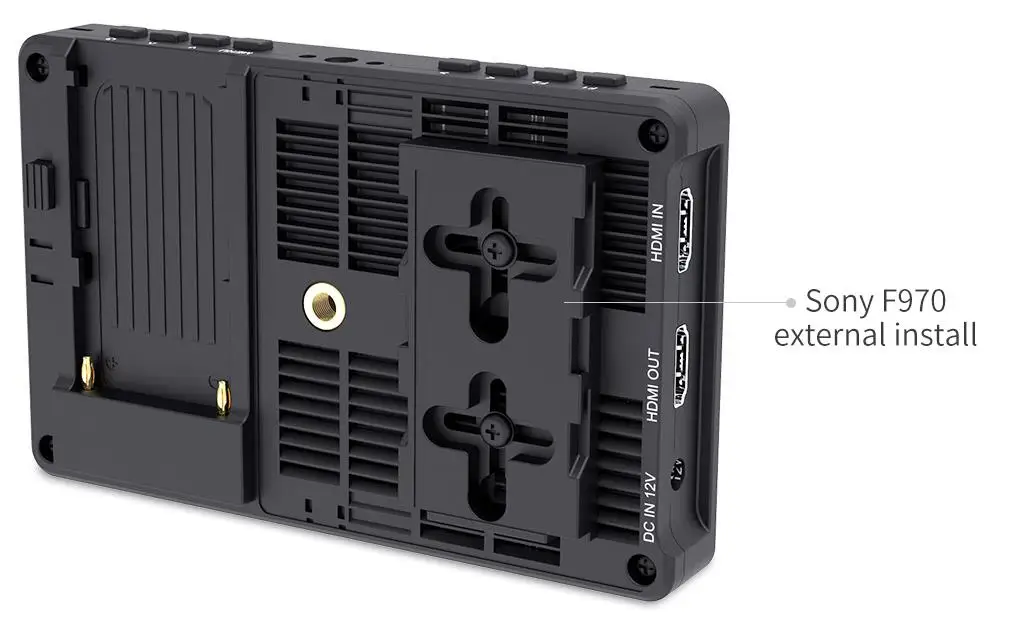 Se agrega un diseño de kit de alimentación y instalación externa Sony F970 en la parte posterior del monitor.El kit externo se puede utilizar para instalar e instalar equipos externos, como transmisores inalámbricos, luces LED, convertidores de vídeo y otros que pueden funcionar con la batería Sony F970.Este innovador diseño de fuente de alimentación externa reduce la necesidad de que los fotógrafos se conecten a una transmisión inalámbrica externa, luz LED y otros equipos, ahorrando en gran medida el espacio ocupado por el equipo y reduciendo el peso del equipo fotográfico.