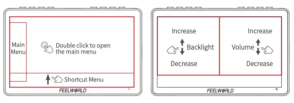 Puedes tocar la pantalla o los botones físicos para navegar por el menú y configurar funciones.El diseño de distribución clave del F5 Pro V4 es simple y fácil de operar.En la parte superior del monitor hay 2 botones de función personalizados, puede configurarlos como funciones de uso común.También puede configurar la función de acceso directo de las teclas izquierda y derecha directamente en la función de configuración del menú, que se puede configurar para ajuste de luz de fondo o ajuste de volumen, presione directamente " " para disminuir el valor; presione directamente " " para aumentar el valor.Y el monitor guardará automáticamente los parámetros que ha configurado anteriormente y mantendrá la configuración original la próxima vez que lo encienda.No es necesario restablecerlo, lo cual es conveniente y sencillo.