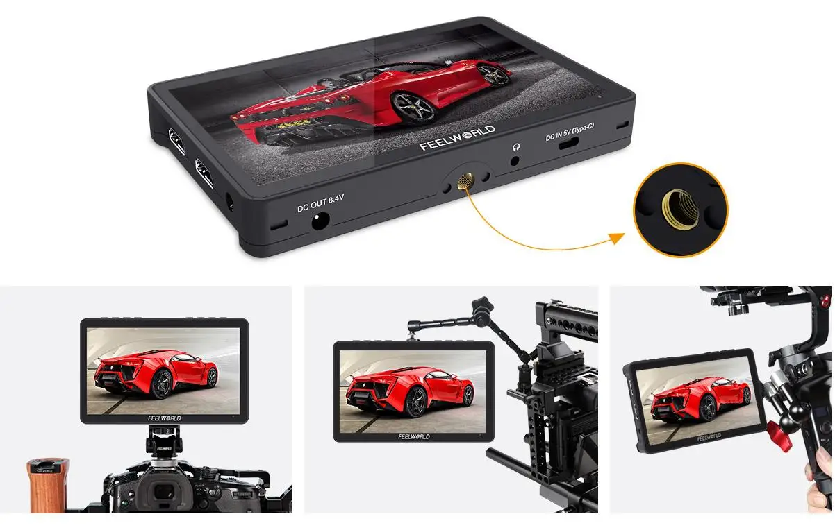F5 Pro V4 cuenta con puntos de montaje estándar de 1/4" (arriba, abajo, derecha, parte media trasera) para conectarlo a cámaras y equipos.¡No solo puede instalarlo en un monitor a través del brazo inclinable, sino que también puede montarlo en un estabilizador portátil o fijarlo de forma segura a la parte superior de su cámara como el visor HD definitivo!Si lo instala en la parte inferior del dispositivo, también puede combinar la función de giro de imagen para mantener la orientación correcta de la pantalla.