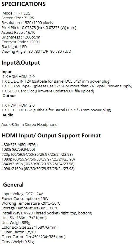 Equipado con entrada y salida HDMI 4K, admite señal de hasta 4096x2160/60p y 3840x2160/60p, compatible con las últimas cámaras DSLR del mercado.Y proporcione un conector para auriculares de 3,5 mm para monitorear el audio.