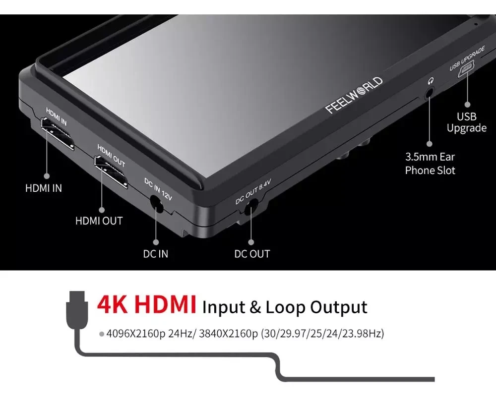 El FW568 V2 tiene entrada y salida HDMI 4K, lo que le permite no solo mostrar señales en vivo, sino también enviarlas a otros monitores simultáneamente.Es la capacidad de mostrar imágenes en vivo en varias pantallas a la vez manteniendo la calidad del vídeo original.