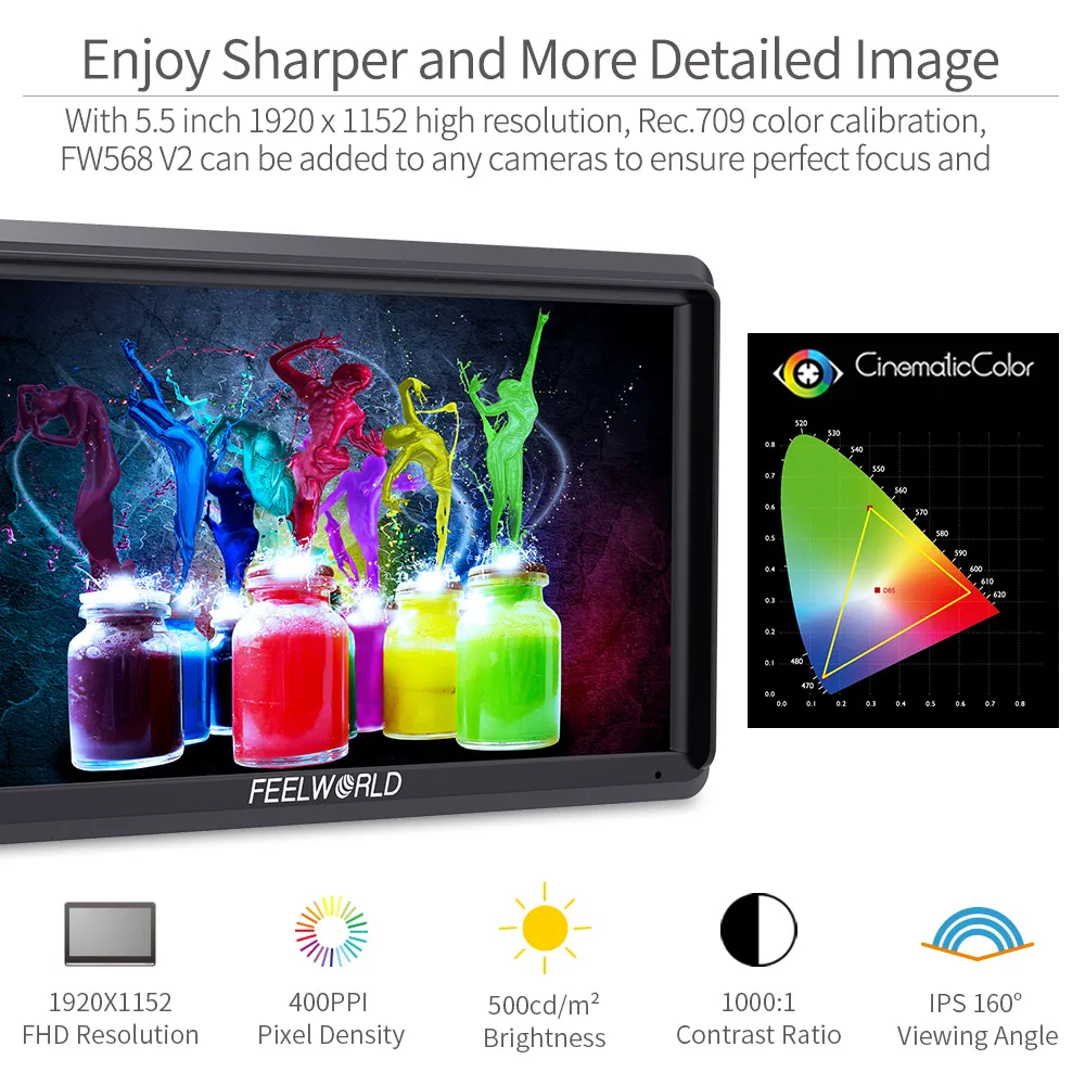 El FW568 V2 es pequeño, liviano y tiene una gran calidad de imagen.El tamaño pequeño es extremadamente útil al filmar en espacios reducidos y donde el peso es importante como con los cardales.El FW568 V2 es el monitor perfecto para quienes necesitan un monitor de cámara liviano y fácil de usar, como operadores de cardán o tiradores que están siempre en movimiento.