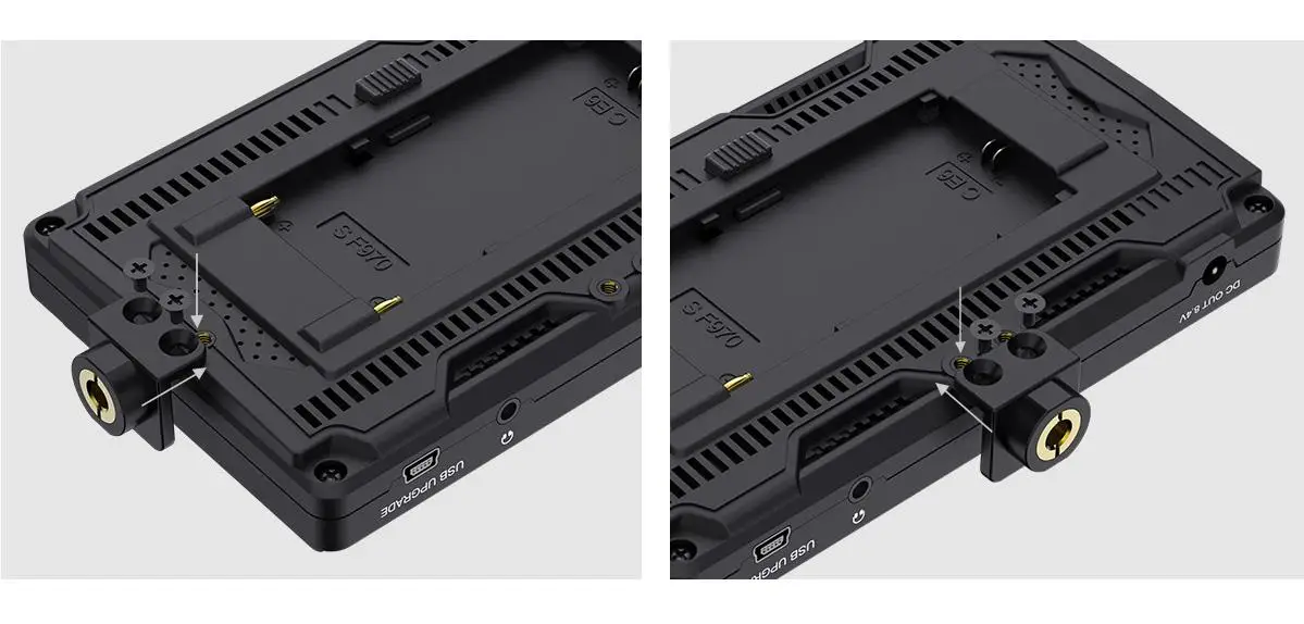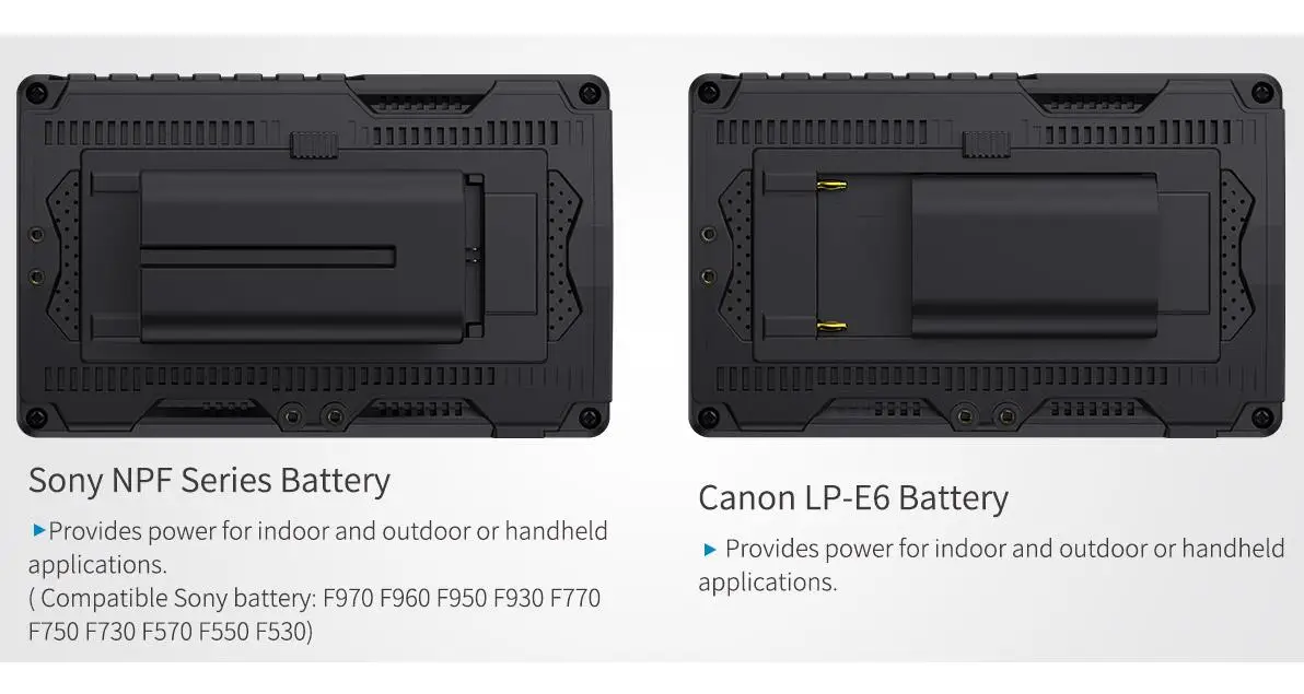 Compatibilidad con baterías de litio Sony F970 y Canon LP-E6 para una placa de batería.Proporciona condiciones de trabajo prolongadas para los camareros en aplicaciones de disparo.