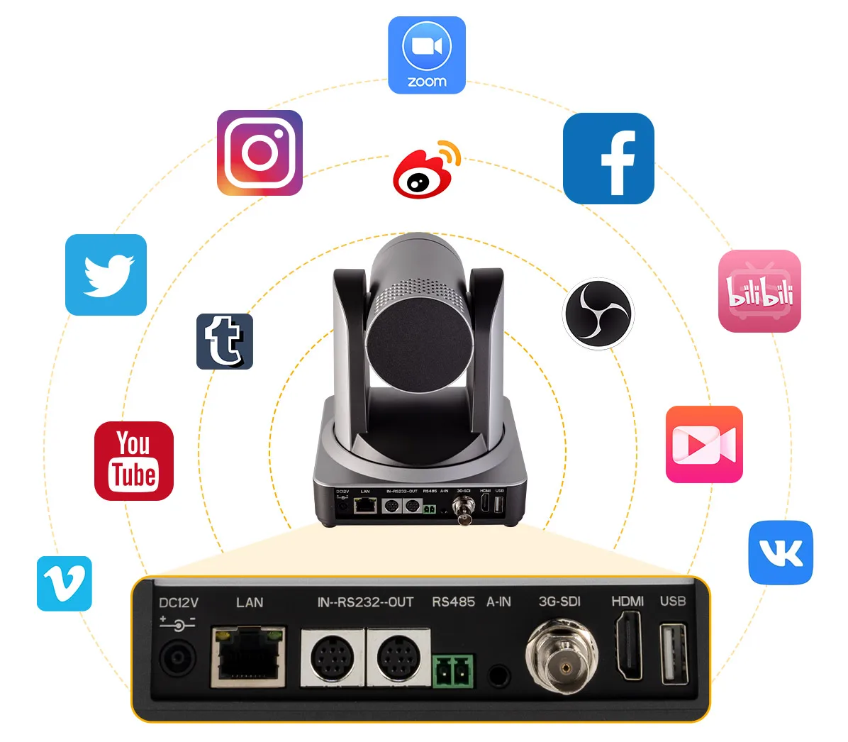 Salida de vídeo múltipleTransmite a tus plataformas favoritasLa salida simultánea de vídeo USB, HDMI, 3G-SDI e IP y el protocolo de red múltiple permiten a POEX20 transmitir fácilmente en vivo a sus plataformas favoritas, como YouTube, Fackbook, Twitch, etc.Nota: El 3 G-SDI está disponible para transmisión de 100m en formato 1080p60.