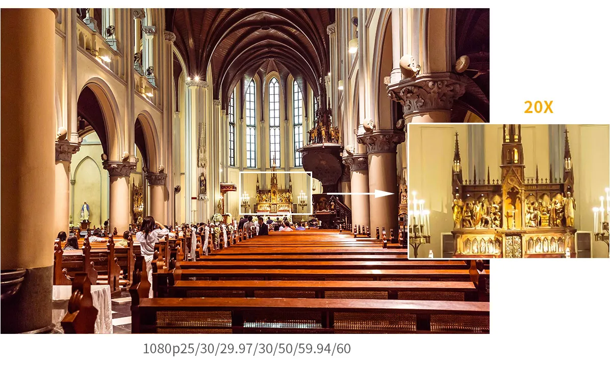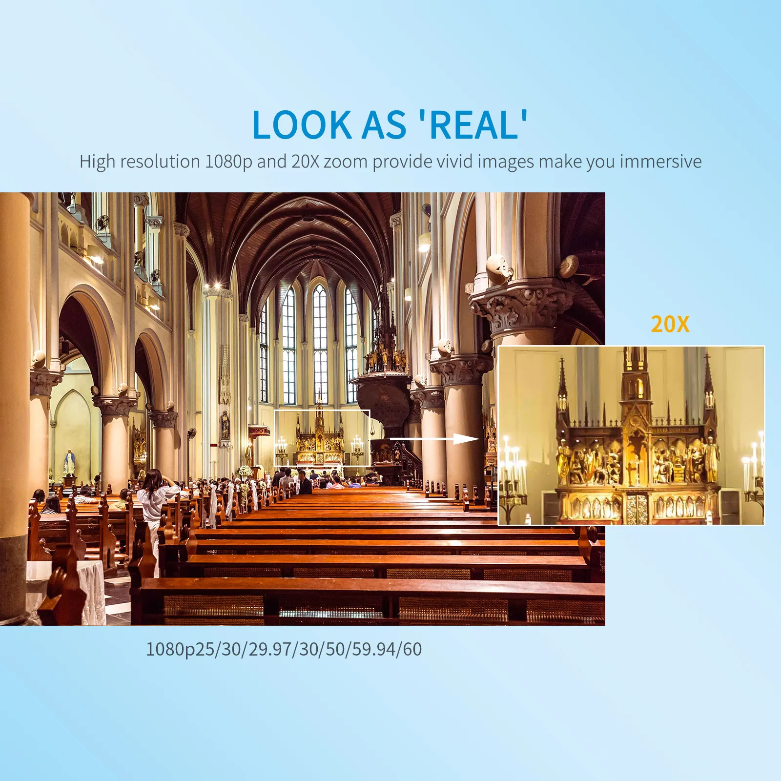Calidad de imagen HD 1080P @ 60 + Zoom óptico 20XRealice una experiencia de vídeo realistaLa alta resolución 1080P @ 60fps, la reproducción de color excepcional, el zoom 20X ofrece ópticas premium y video realista para crear la experiencia de sentarse juntos en la misma habitación, incluso si estás a mil millas de distancia.