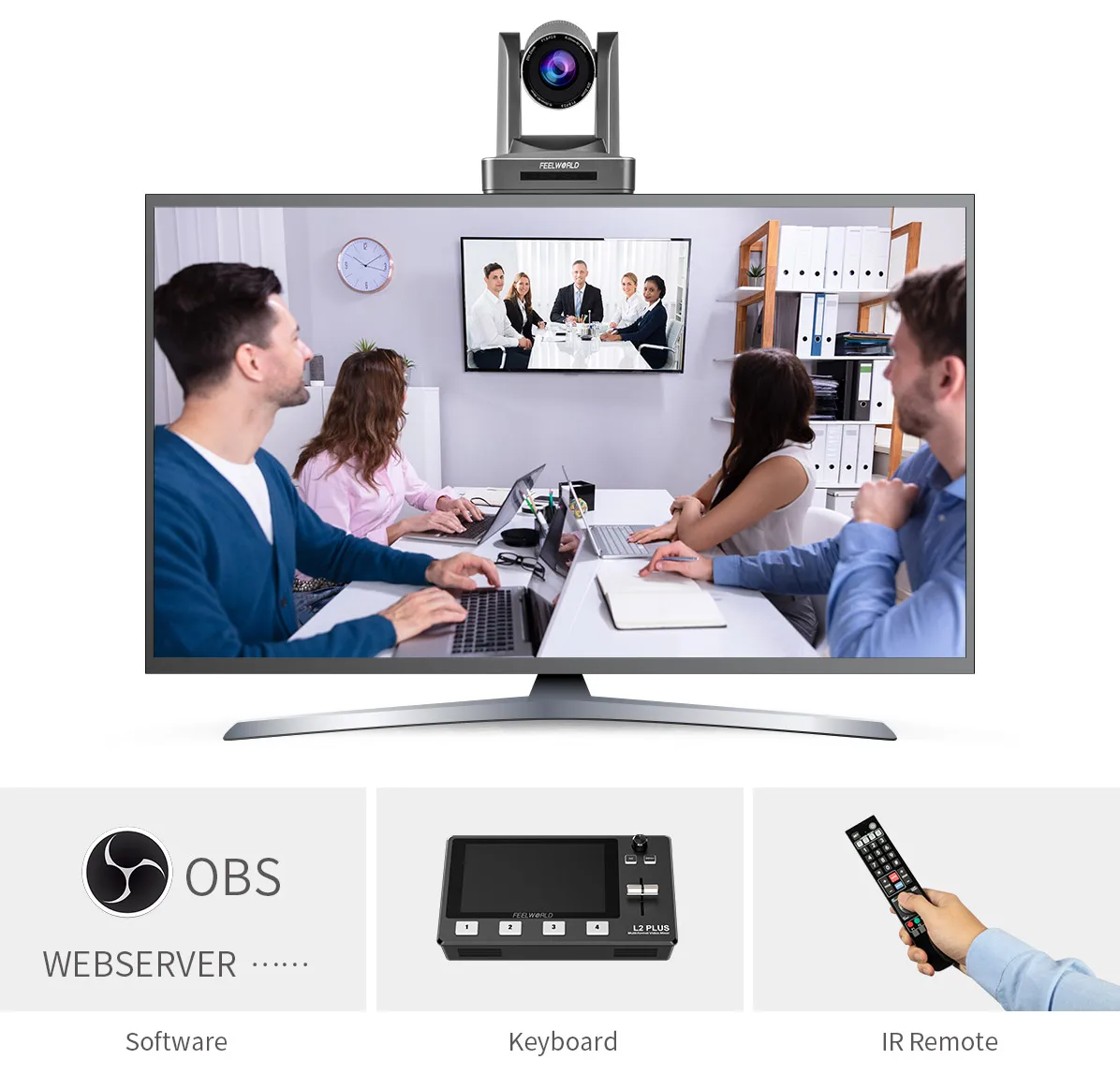 Múltiples formas de controlar su cámaraPuede desplazarse, inclinar y hacer zoom con el control remoto de mano para ver todo en su espacio de trabajo. También puede utilizarlo desde una ubicación remota con el software WBESREVER o el conmutador de vídeo FEELWORLD L2 PLUS.Nota: la distancia del control remoto IR es de aproximadamente 10m, cuanto mayor sea el nivel de la batería, mejor efecto.