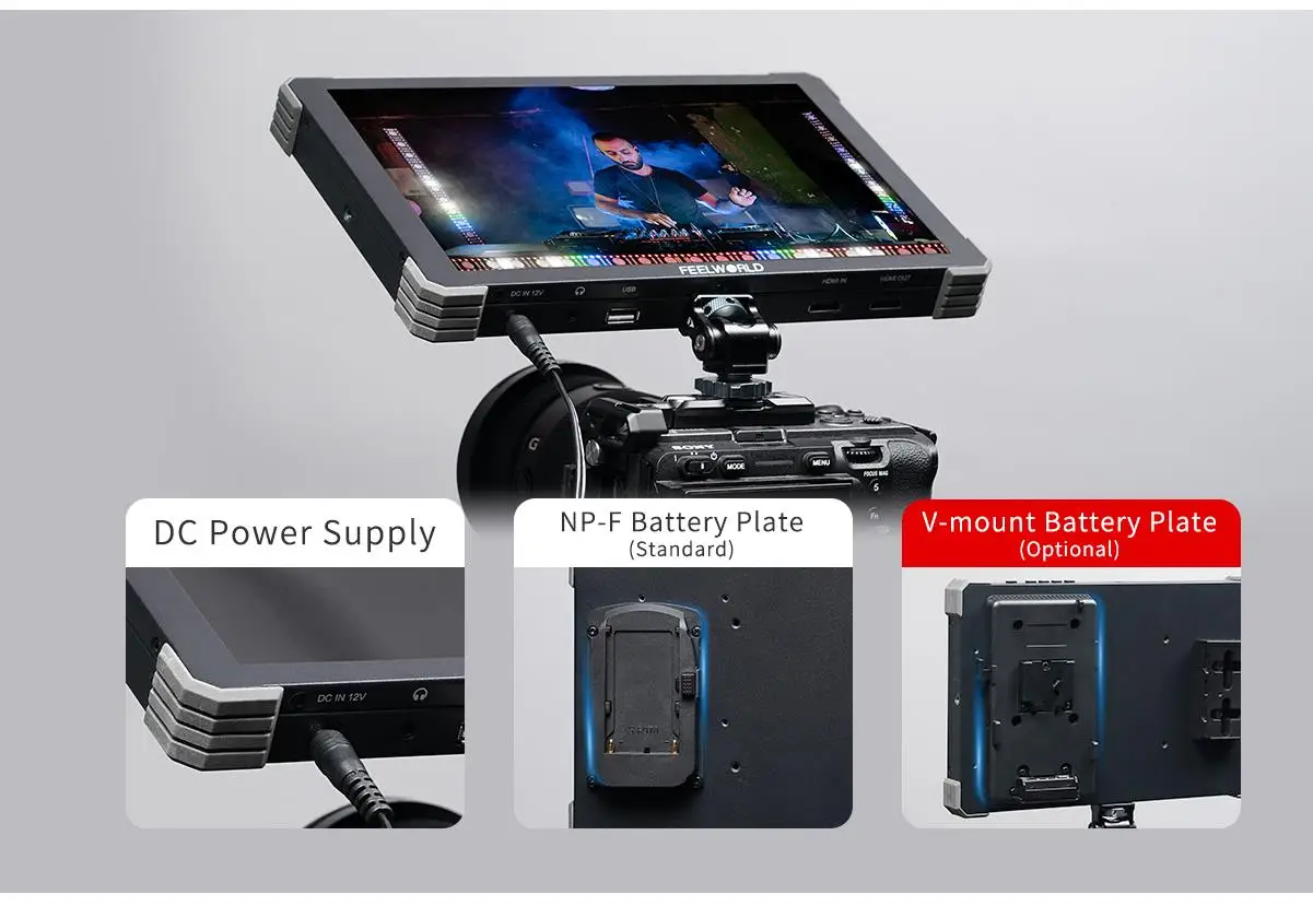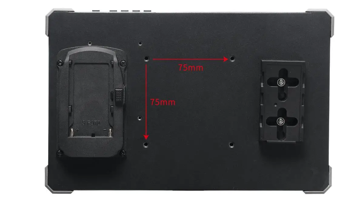 A Sony F970 external install and power kit design is added to the back of the monitor. The external kit can be used to install and install the external equipment, like wireless transmission, LED light, video converter and others that can be powered by a Sony F970 battery. This innovative external power supply design meets the need to power for external wireless transmission, LED light and other equipment, greatly saving the space occupied by the equipment and reducing the weight of filming equipment.