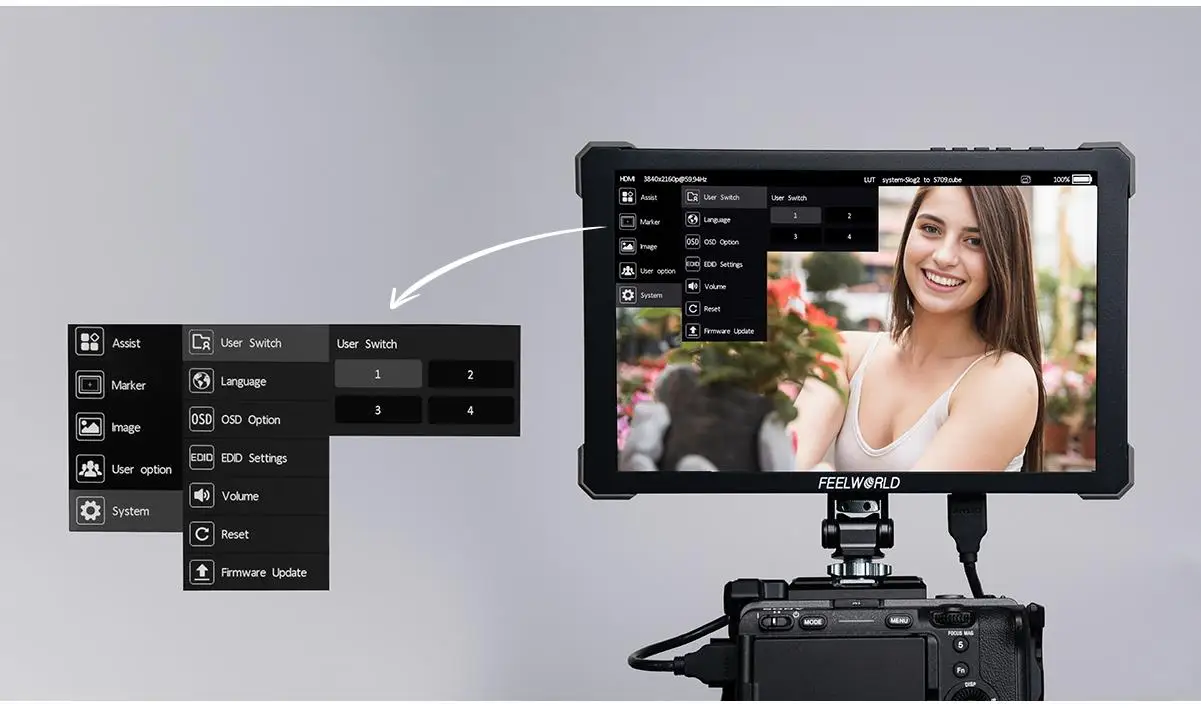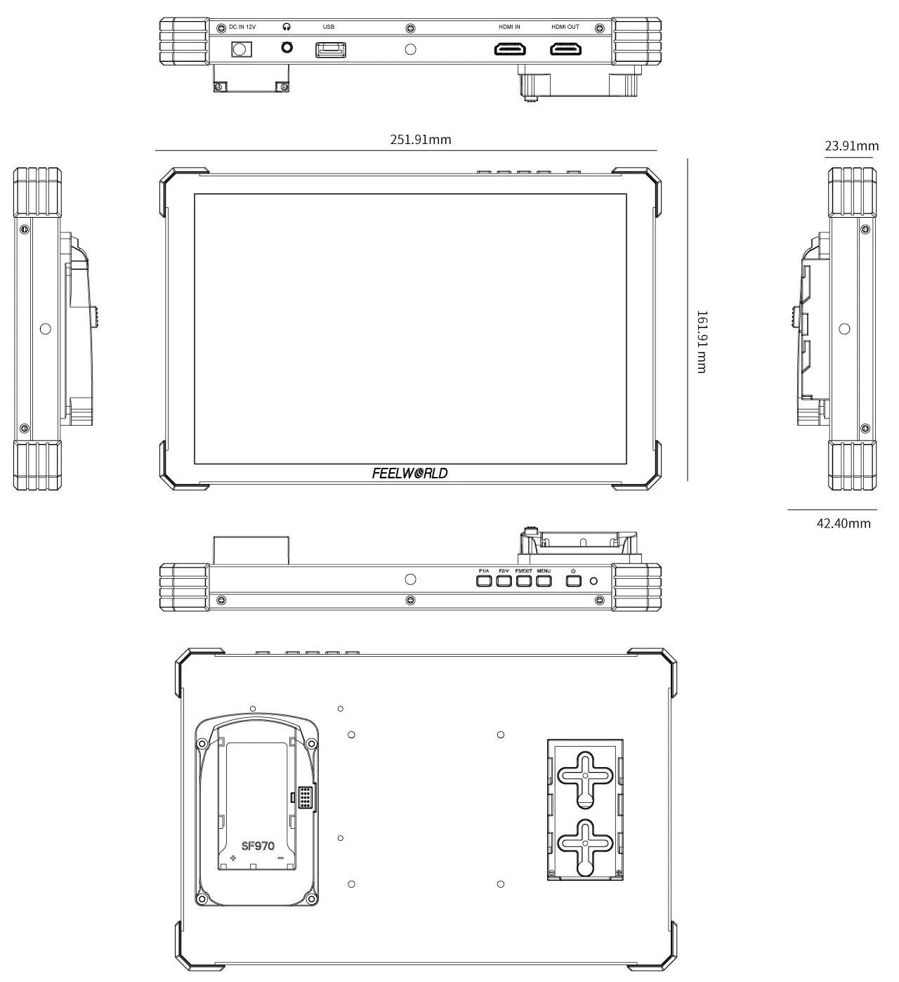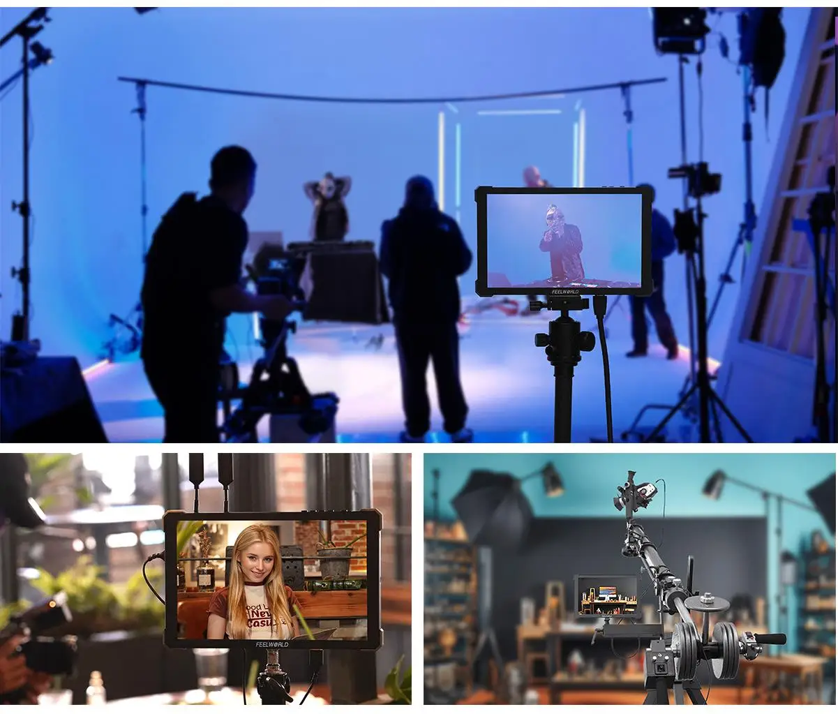 FEELWORLD T10 is a 10.1-inch full HD touch monitor. Equipped with aluminium housing, lightweight and durable; support up to 4K@60Hz HDMI input and output, and provide a series monitoring and composition tools. There is a F970 external install and power kit on the rear of T10, which can install such as wireless transmission, LED light, etc. It combines the monitor with wireless transmission to get rid of unnecessary cables, which is perfect for director monitoring, 1st AC to focus pulling in the film crew. In addition, for some jib crane shooting such as large-scale event, live performance, TV program, T10 is also a good choice.