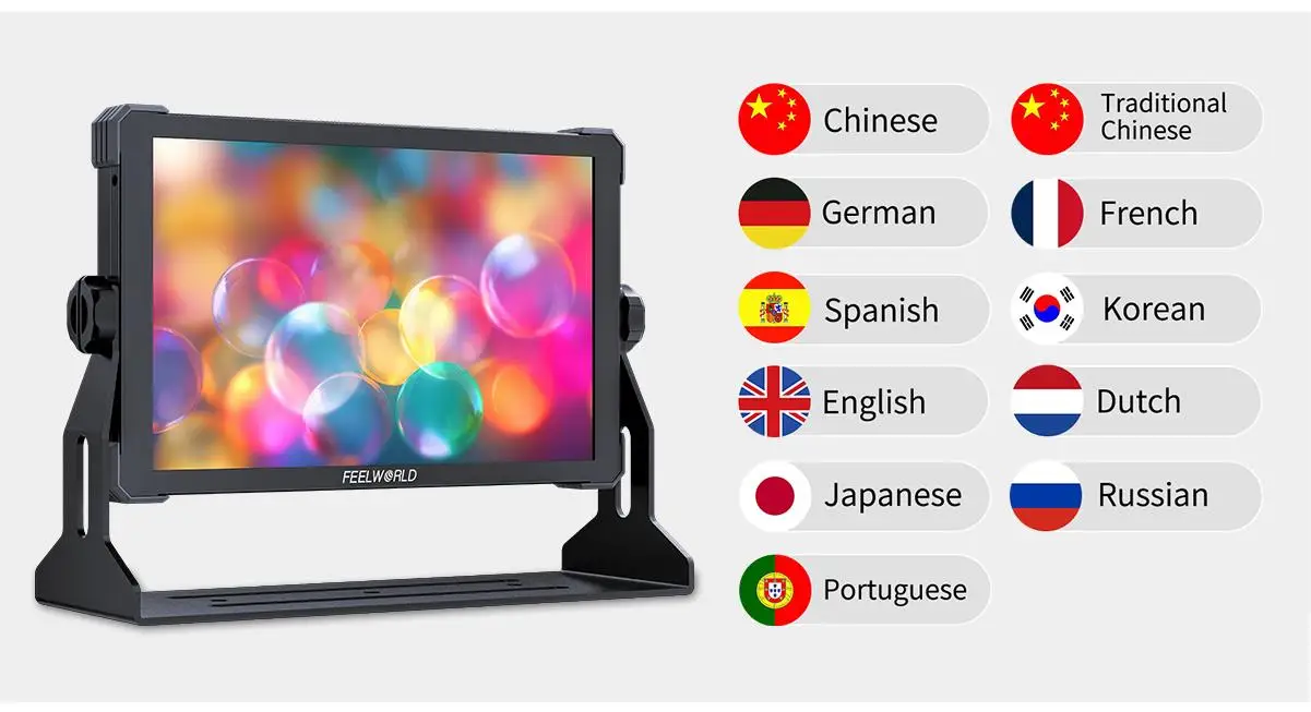 The monitor is equipped with 4 standard 1/4”mounting threads (top, bottom, right side, left side), you can easily mount it on the camera or other types of equipment with a magic arm, bracket, etc.. Meet the different monitoring for photographer or director.